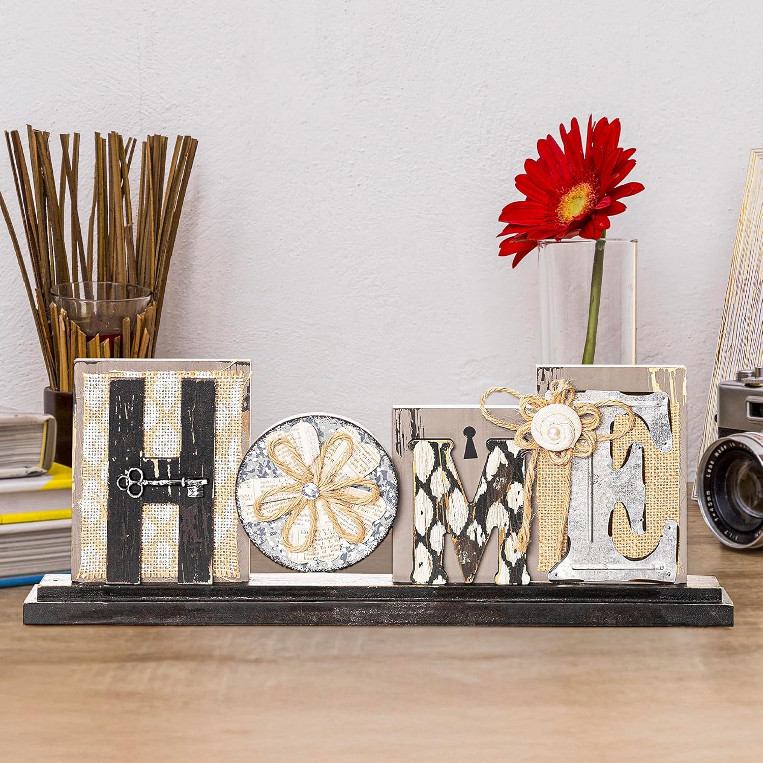 - HOME SIGN: Appealing accents embellish this large wooden sign while adding a unique homemade style. Our rustic art piece spells out the word HOME in uppercase letters with striking accessories, metal and felt materials and a cute decorative flower.