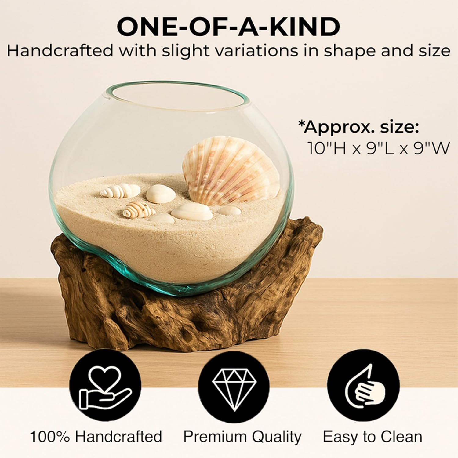 - ECO FRIENDLY BEAUTY: Our hand-blown bubble glass terrarium is as beautiful as it is unique. Each one is different from the next, providing you with a one-of-a kind planter, centerpiece, succulent garden or air plant display. Hand-crafted from glass and driftwood by artisans in Bali, Local artists used blow pipes to transform melted shards of collected scrap glass into a one-of-a-kind bowls that fit snugly into the driftwood-root base.