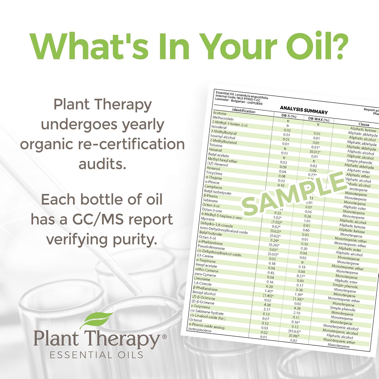 - BATCH SPECIFIC GC-MS REPORTS ON EVERY OIL: Every bottle of oil from Plant Therapy goes through multiple rounds of testing including organoleptic and multiple rounds of GC-MS testing by a third-party laboratory.