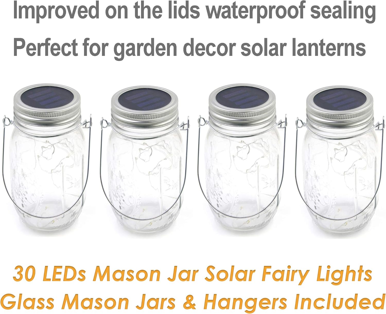 - Waterproof Seal Design:Each mason jar fairy light have a O-shape seal ring to prevent the rain water percolate into the light lid and jar.Great idea for outdoor fence patio lawn garden decorations,pary,wedding,pathways,sun rooms,tables,bookshelves or window sills decoration Light,mason jar decor solar lanterns.