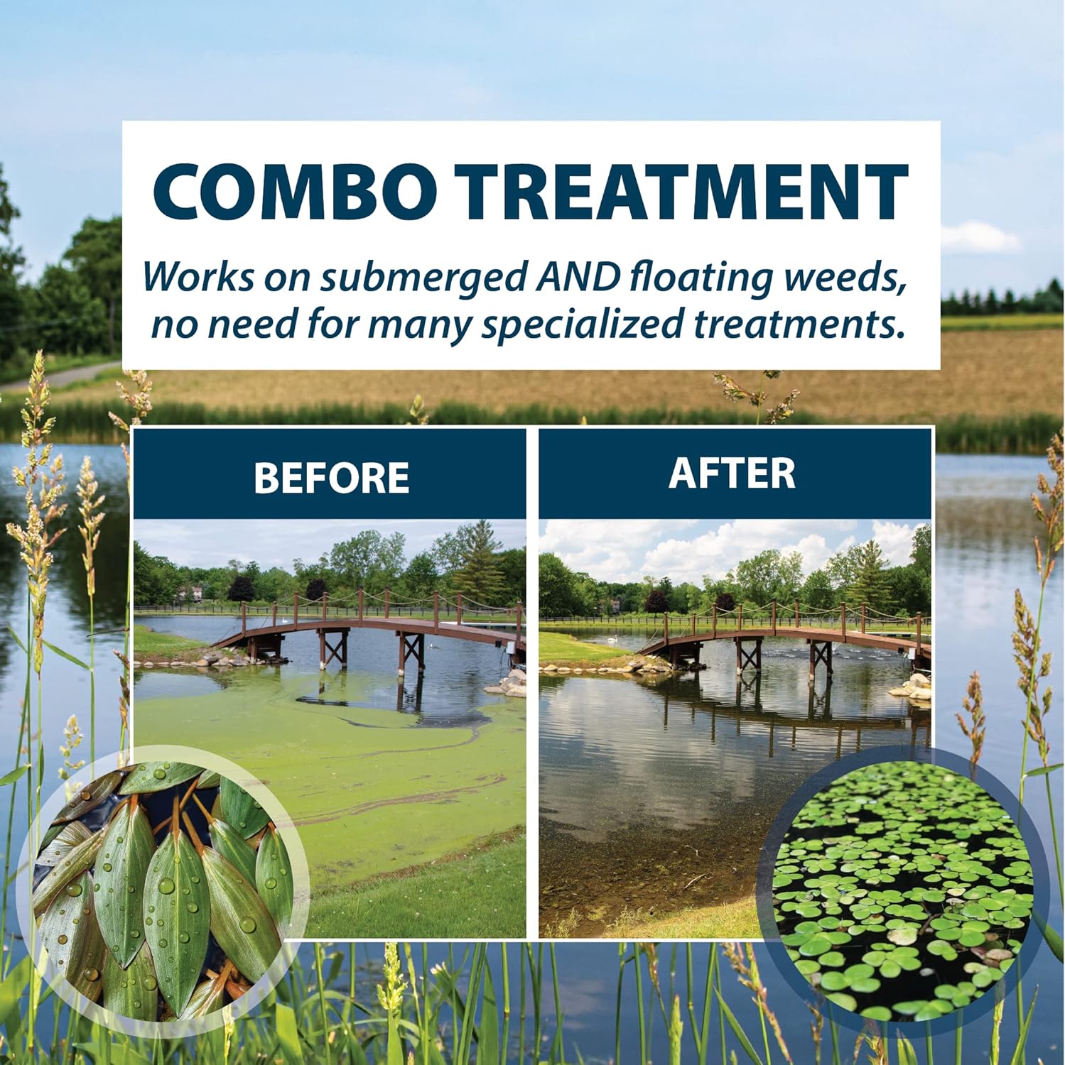 - Combination Treatment Effective on Floating & Submerged Aquatic Weeds: Controls duck weed, water lilies, coontail, fanwort, watermilfoil, American pondweed, bladderwort, curly leaf pondweed, hydrilla, elodea, lily pads, sago pondweed, spatterdock, southern naiad, and other common species.