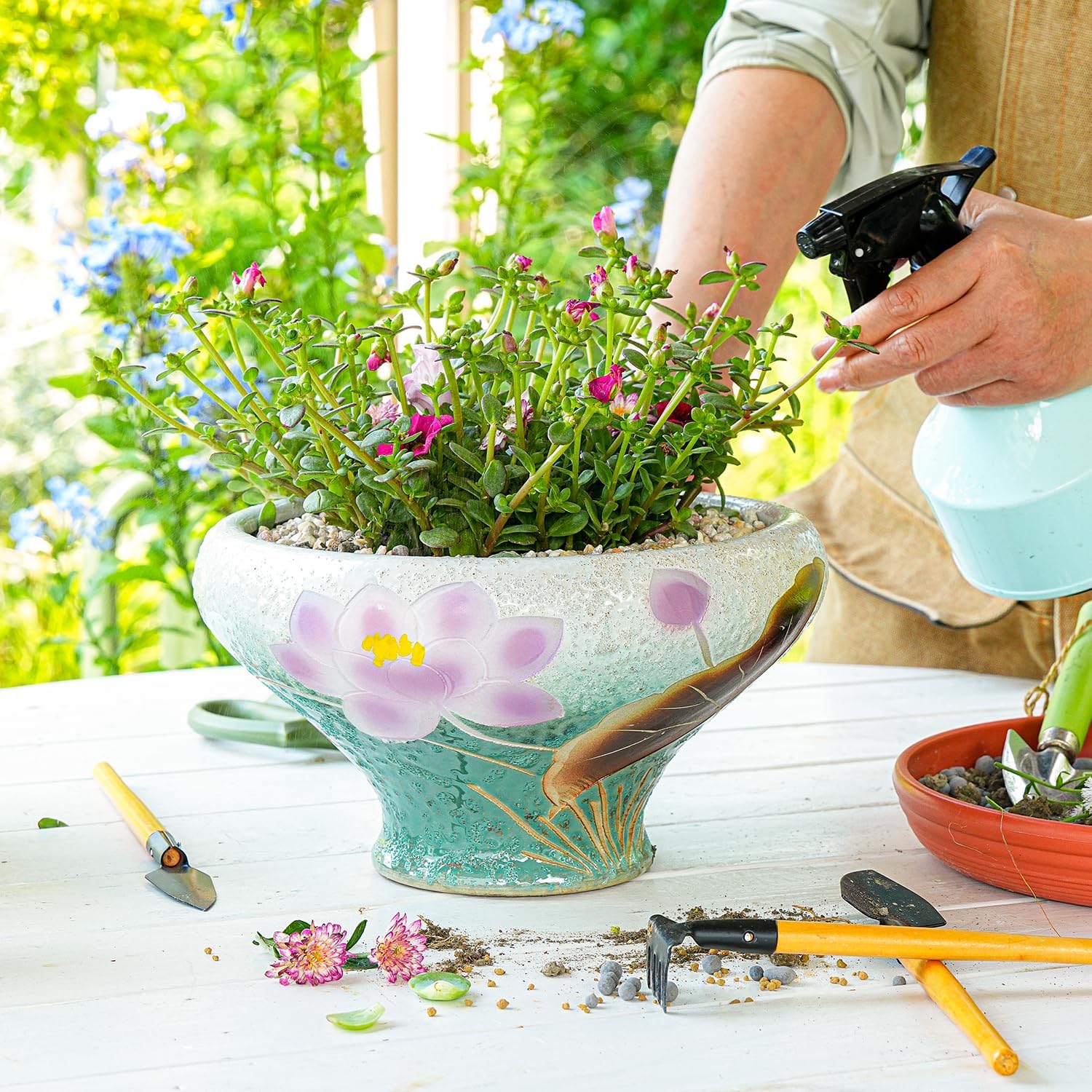 Sungmor 9.6 Inch Large Succulent Plant Pots, Pretty Hand Painted Ceramic Planter with Drainage, Indoor Outdoor Cactus Planter Bonsai Pot, Flower Pot for Indoor Plants Garden Windowsill Desktop Decor