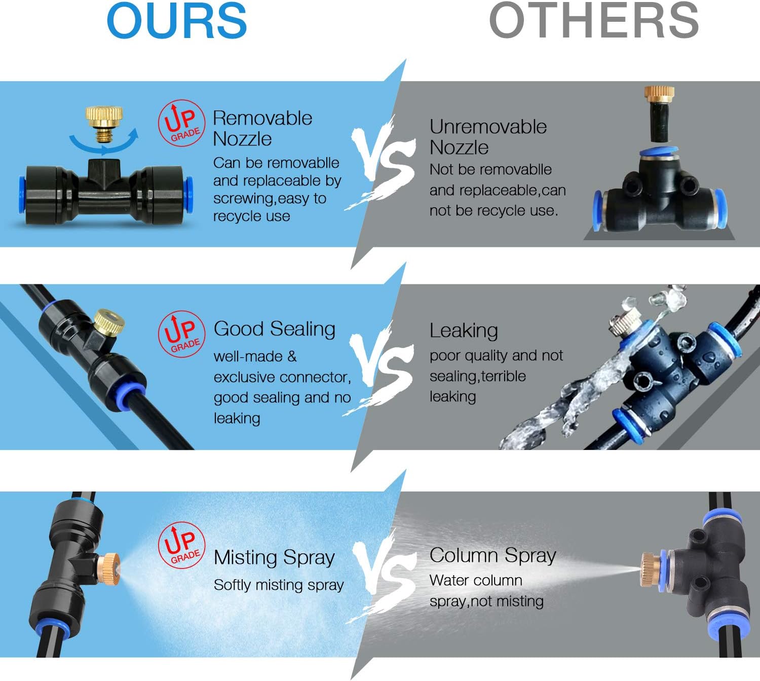 - Easy to Install: Instruction is included. Just need 2 steps in 3 seconds to set up the mister nozzles. NOTE: Recommended to fully and firmly insert the tubing into the tee connector to prevent leaking