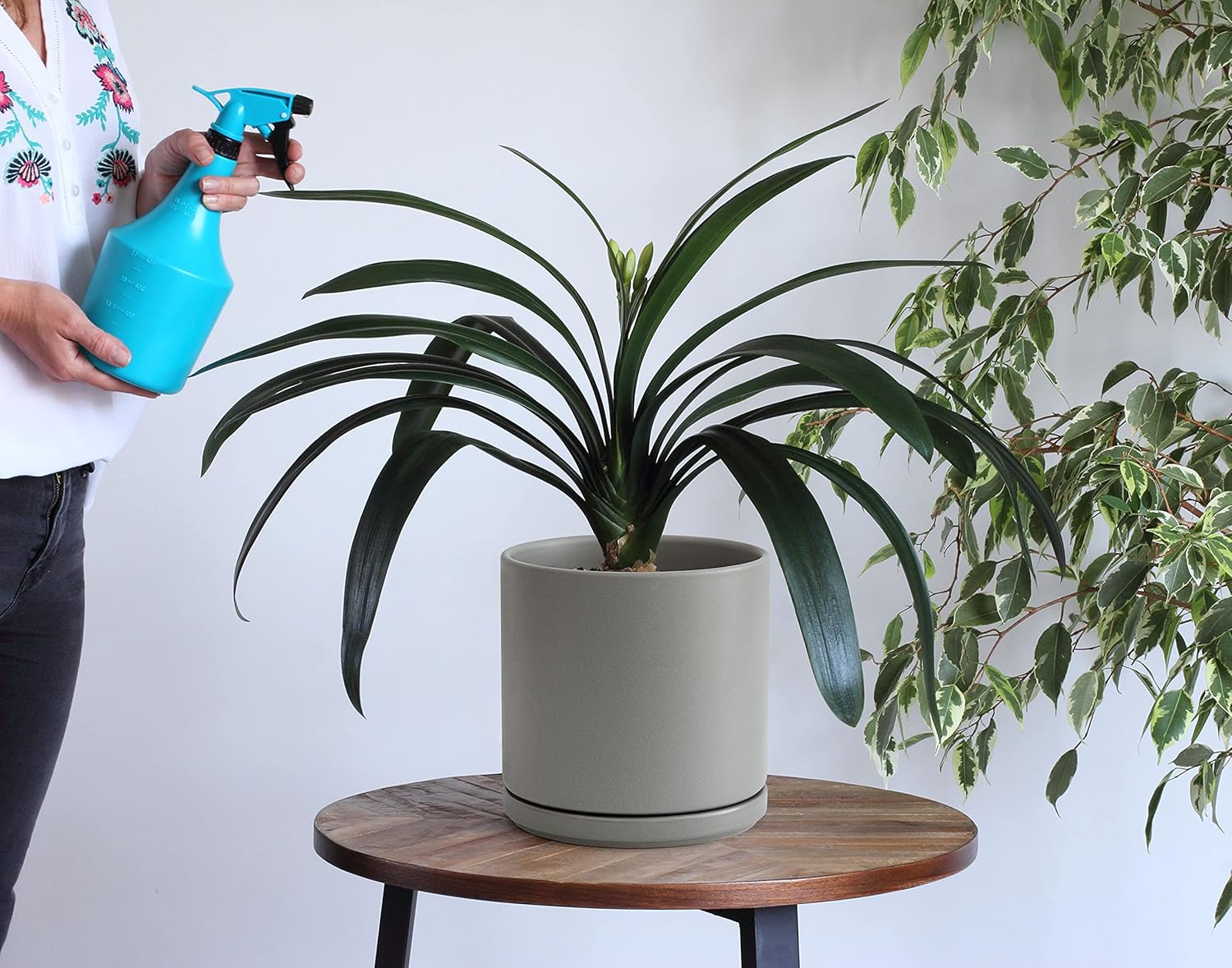 - Simple, elegant, and modern cylindrical straight round planter pot with saucer and drainage hole.