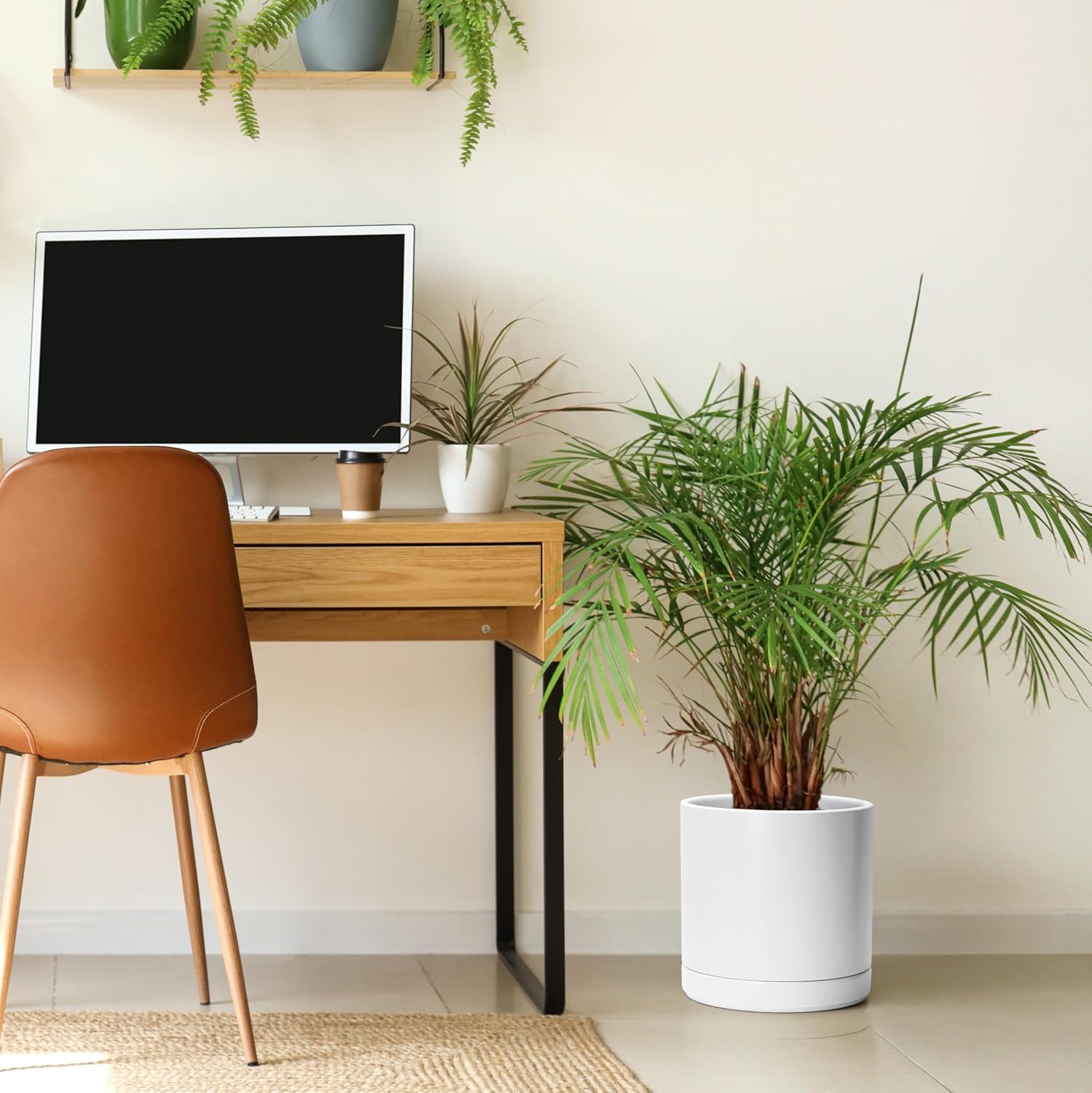 D'vine Dev 10 Inch Ceramic Planter Pot with Drainage Hole and Saucer, Indoor Cylinder Round Planter Pot, White, 94-O-E-1