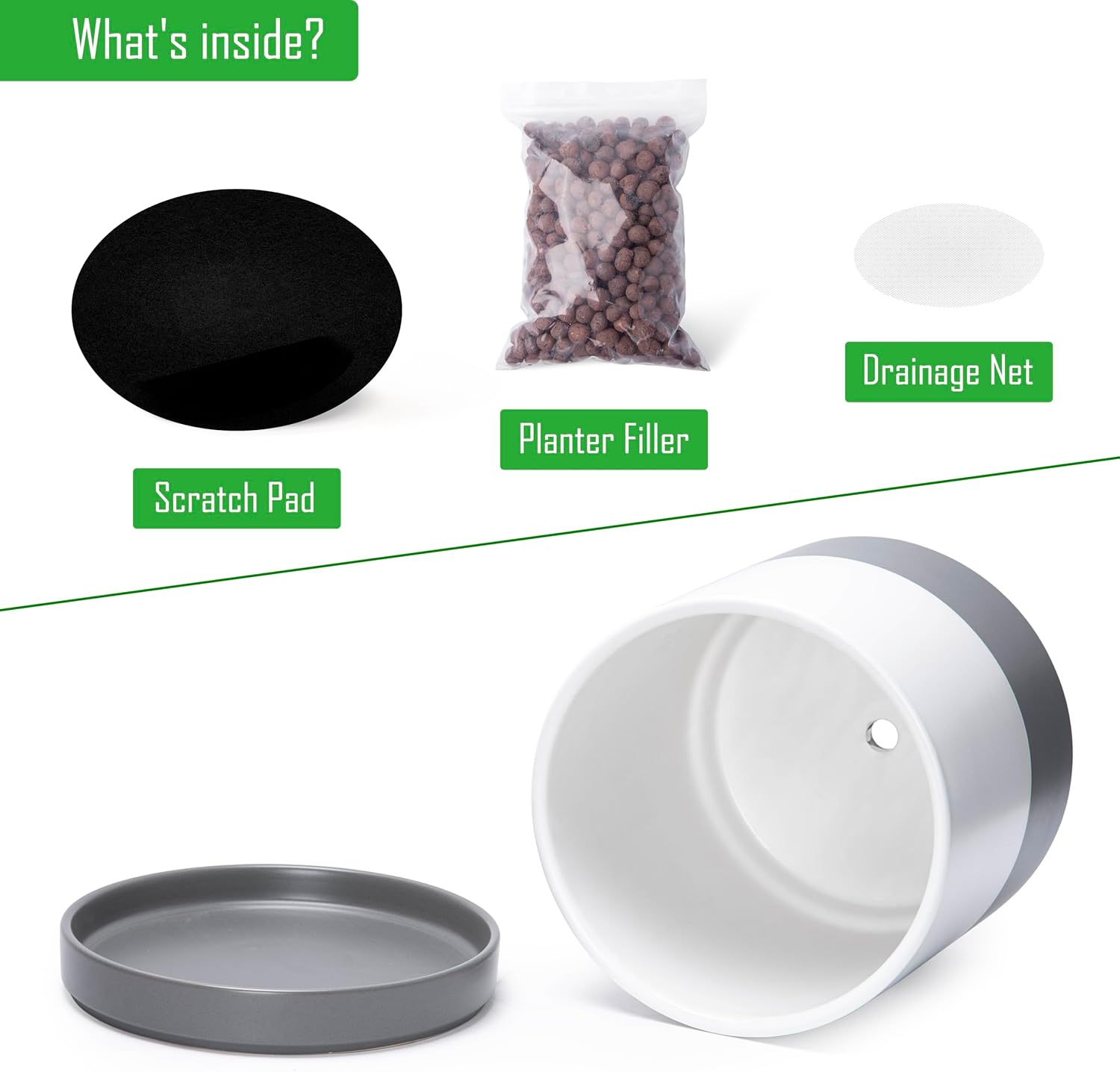 - Planter pot with drainage hole, mesh drainage net and protective scratch pad included.