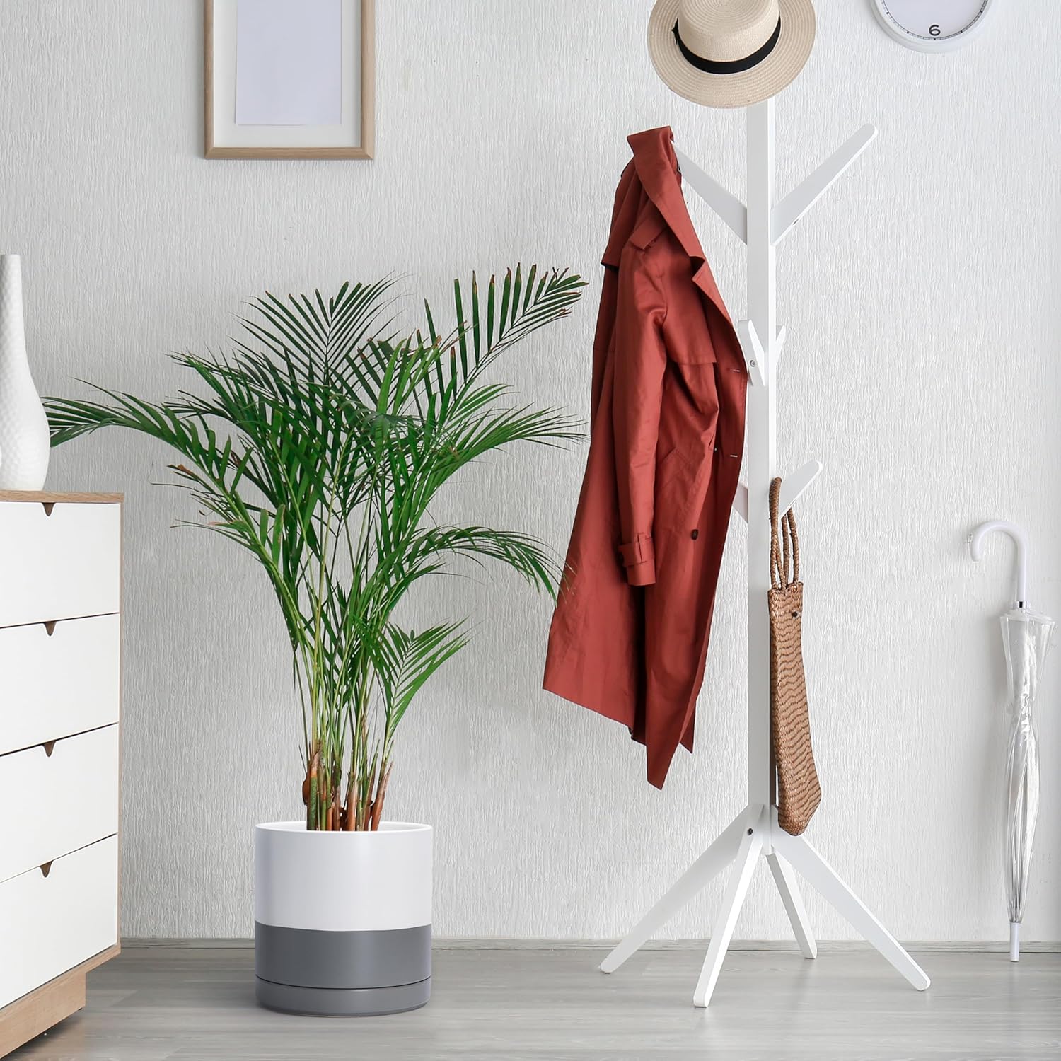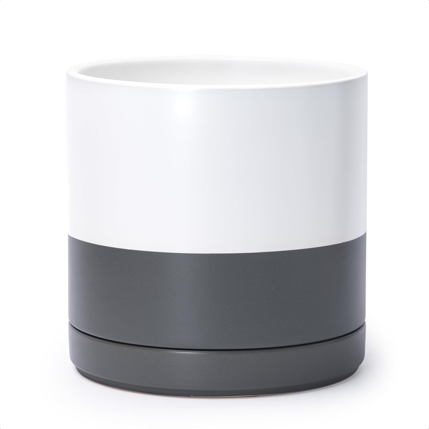 - Simple, elegant, and modern cylindrical straight round planter pot with saucer and drainage hole.