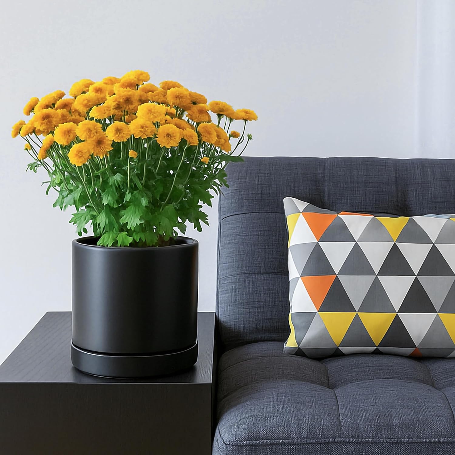 - Simple, elegant, and modern cylindrical straight round planter pot with saucer and drainage hole.