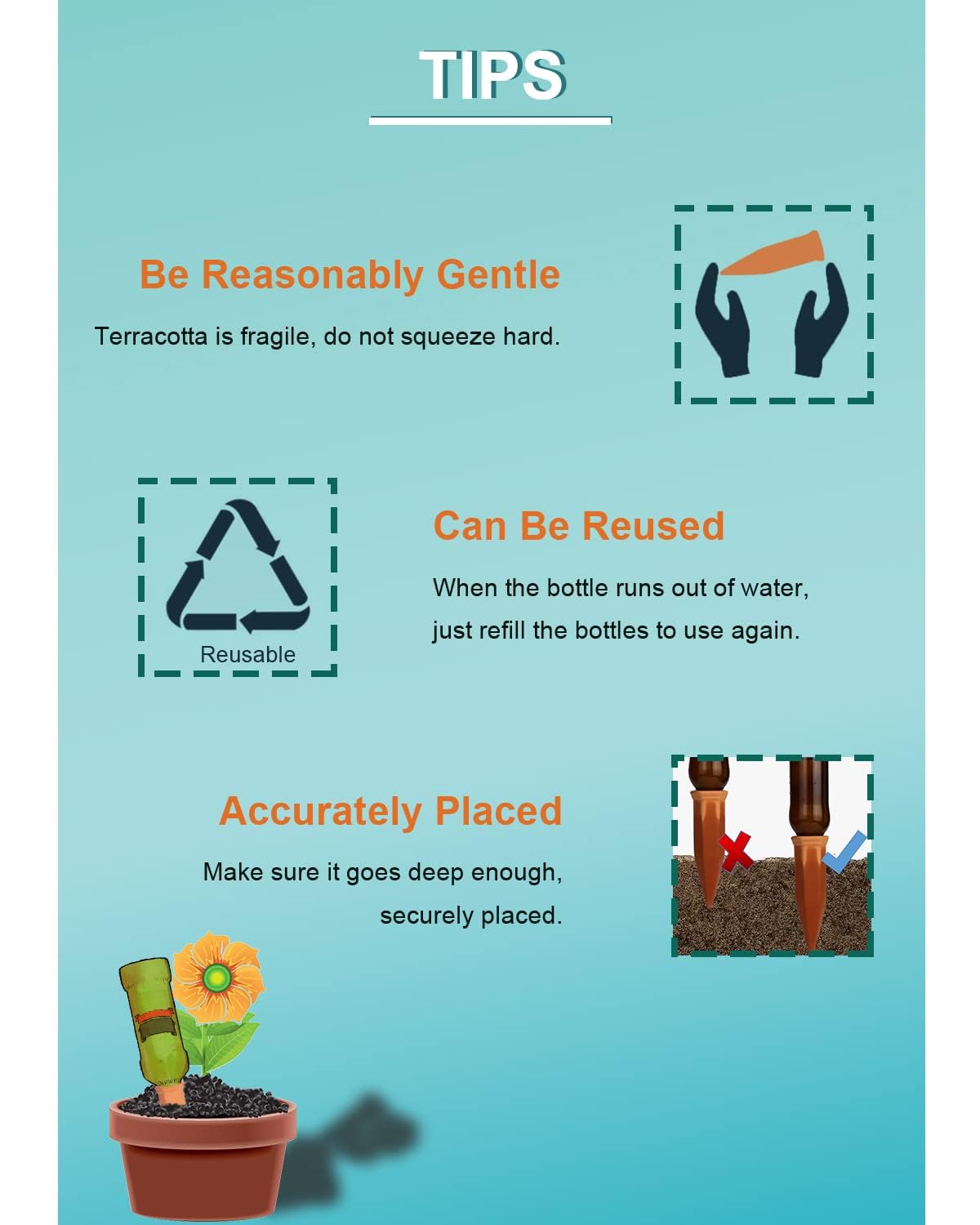 - SAVE YOUR TIME: Terracotta watering spikes work through osmosis to moisten the soil and the plant root, delivering right amount of water to plant without frequent watering even in hot summer day.