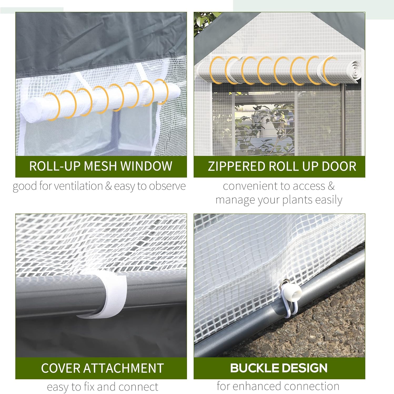 - Control The Exposure: The roll-up windows of the reinforced steel greenhouse have screens that helps control the amount of heat and light that enters the hot house enter and exits quickly via the zippered doors.