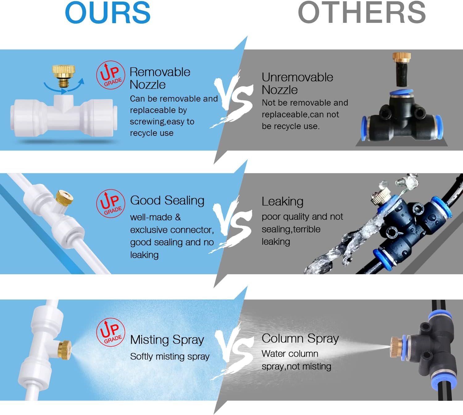 - Easy to Install: Instruction is included. Just need 2 steps in 3 seconds to set up the mister nozzles. NOTE: Recommended to fully and firmly insert the tubing into the tee connector to prevent leaking