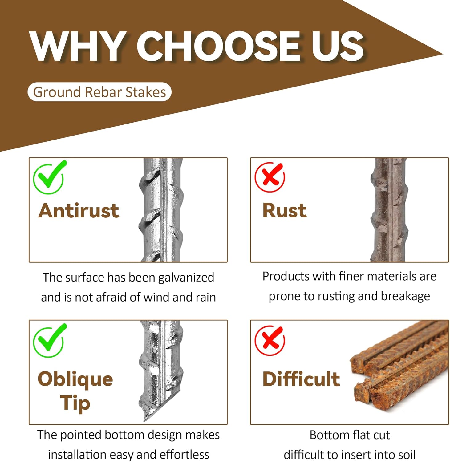 - Versatility in Applications: These rebar stakes offer versatility in their applications. They can be used for a wide range of purposes, including securing outdoor furniture, tents, canopies, tarps, pet enclosures, garden structures, and much more. Their adaptable design makes them suitable for various outdoor activities and projects