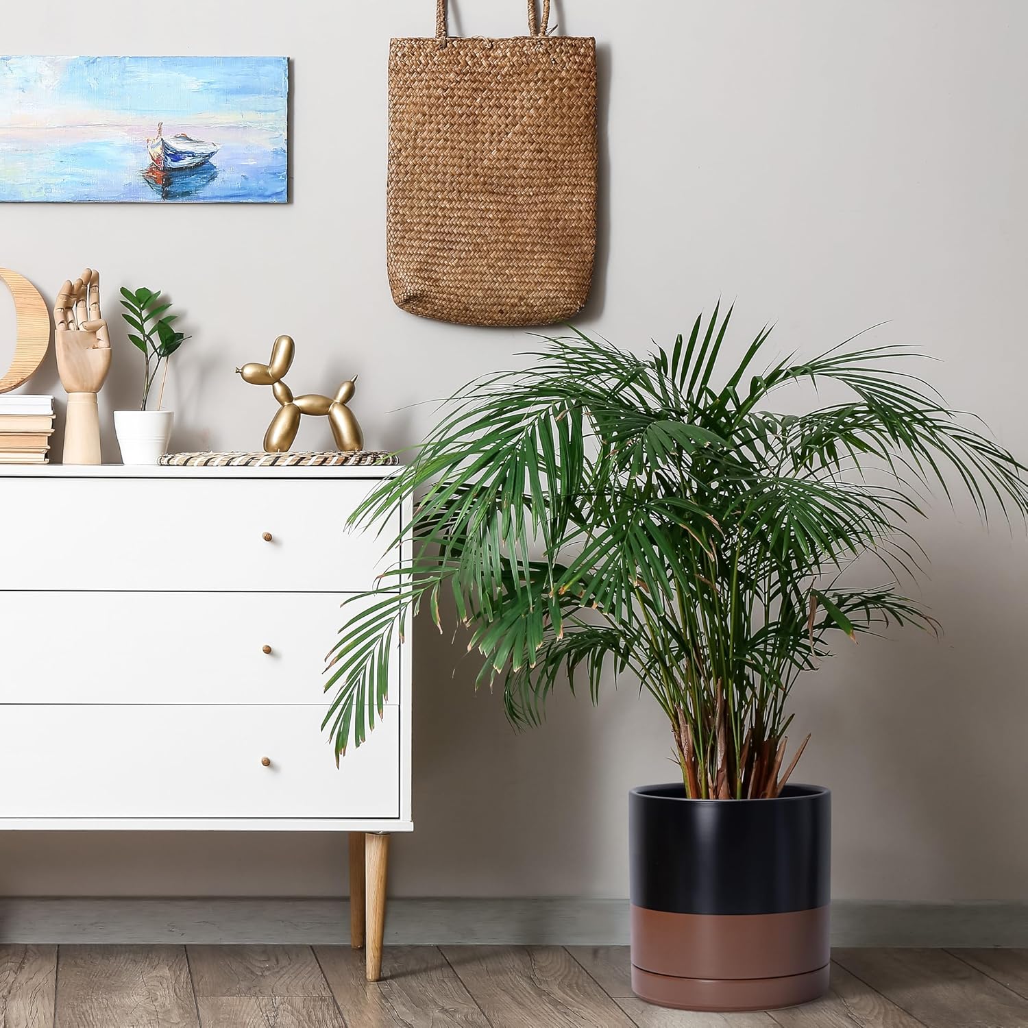 - Planter pot with drainage hole, mesh drainage net and protective scratch pad included.