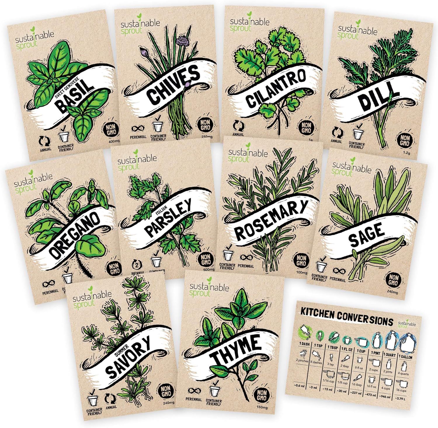 - EXCLUSIVE HERB SEED VARIETY PACK with BONUS MAGNET: Elevate your culinary experience with Sustainable Sprout's Ultimate Herb Seed Variety Pack. Grow your kitchen herb garden with popular varieties such as basil, cilantro, parsley, chives, thyme, oregano, dill, rosemary, sage, and summer savory. As a bonus, receive a Kitchen Conversion Magnet for added convenience in your cooking space. Perfect for homesteading essentials, prepper supplies, seed vault kit heirloom seeds or seed starter kits.