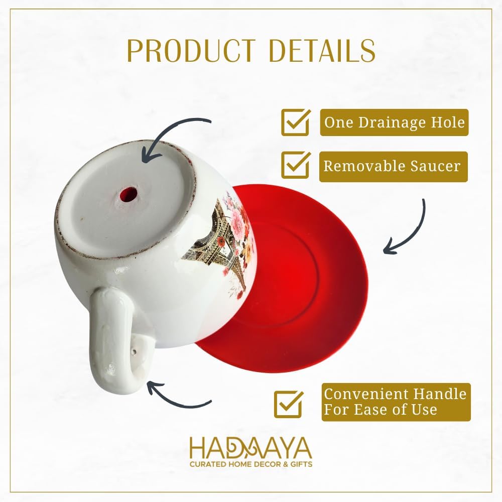 - PREMIUM MATERIAL: Made of Premium Quality Ceramic. These unique Tea Cup Shaped Red and white Planters are hand-painted with a Saucer drip tray and a comfortable handle.