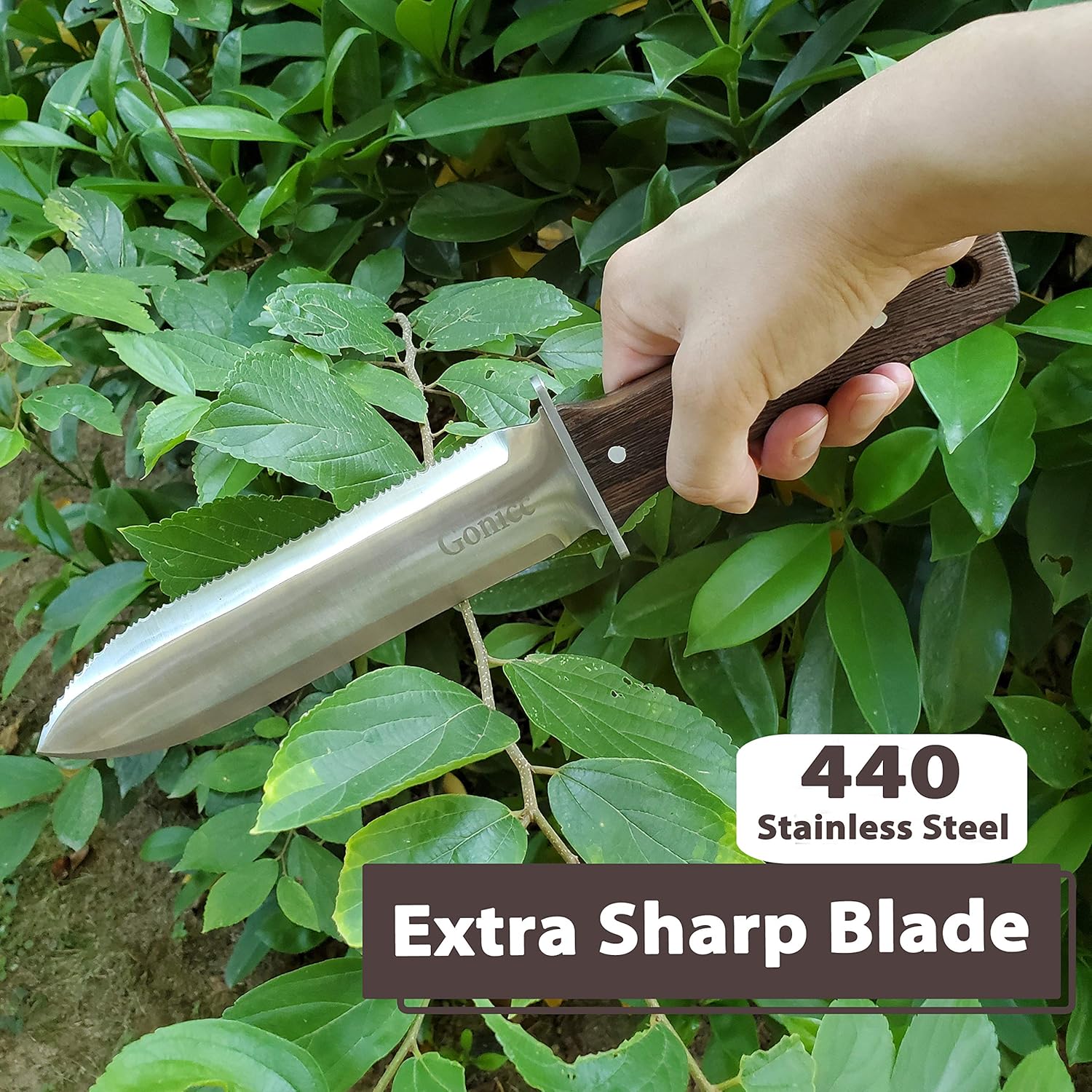 gonicc Professional Hori Hori Garden Knife with Leather Sheath, Protective Handguard, High polished 440 Stainless Steel Blade, Sharpening Stone Included, for Weeding, Digging, Pruning, and Cultivating