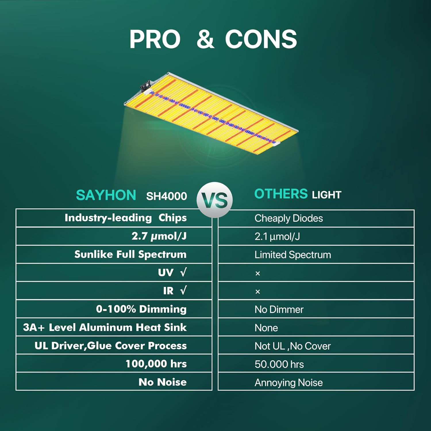 - 🌿 Ideal Cooling System: Full coverage 3A+ level aluminum heat sink can lower temperatures 50°F greater than other brands, Sayhon led grow light maintain brightness at 95%+ after 3 years of use.