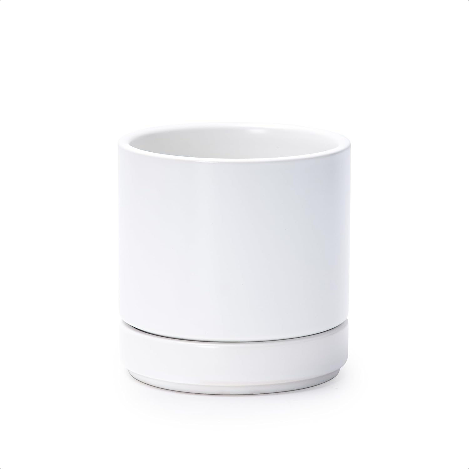 D'vine Dev 4.7 Inch Ceramic Planter Pot with Drainage Hole and Saucer, Indoor Cylinder Round Planter Pot, White, 94-O-B-1