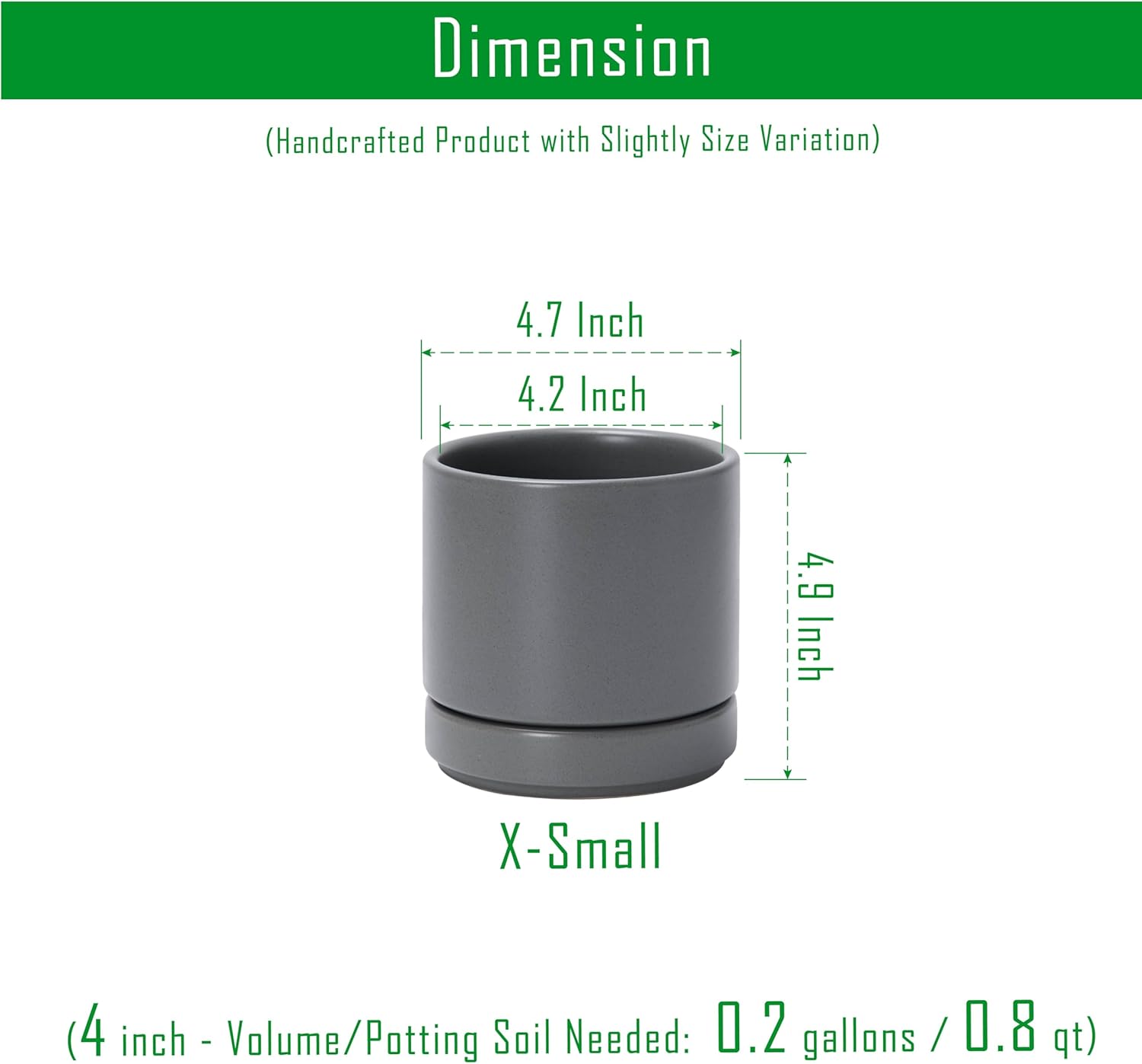 - X-Small 4.7 Inch Planter Pot: 4.7" Diameter x 4.9" H, grey color. Potting Soil Needed: 0.2 gallons / 0.8 qt.