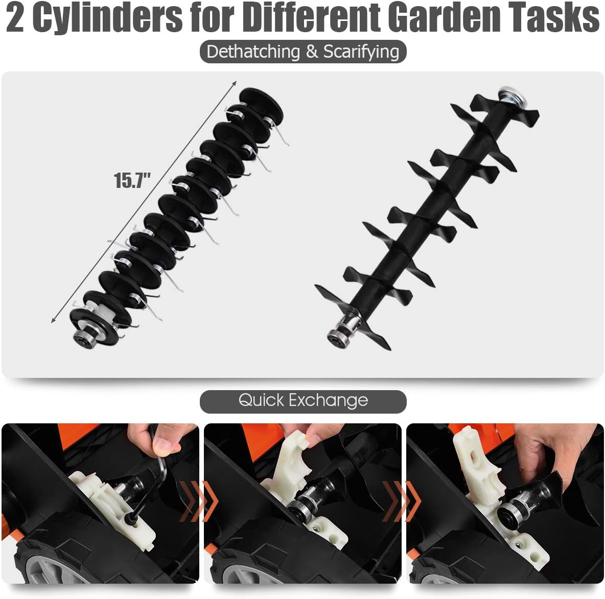 - 【Folding & Carrying Handle】The foldable handle design is ideal for storage and it is easy to assemble and fold without extra tools. Plus the carrying handle, this scarifier can be carried effortlessly. Besides, 2 different sizes of wheels can turn at will and move flexibly.