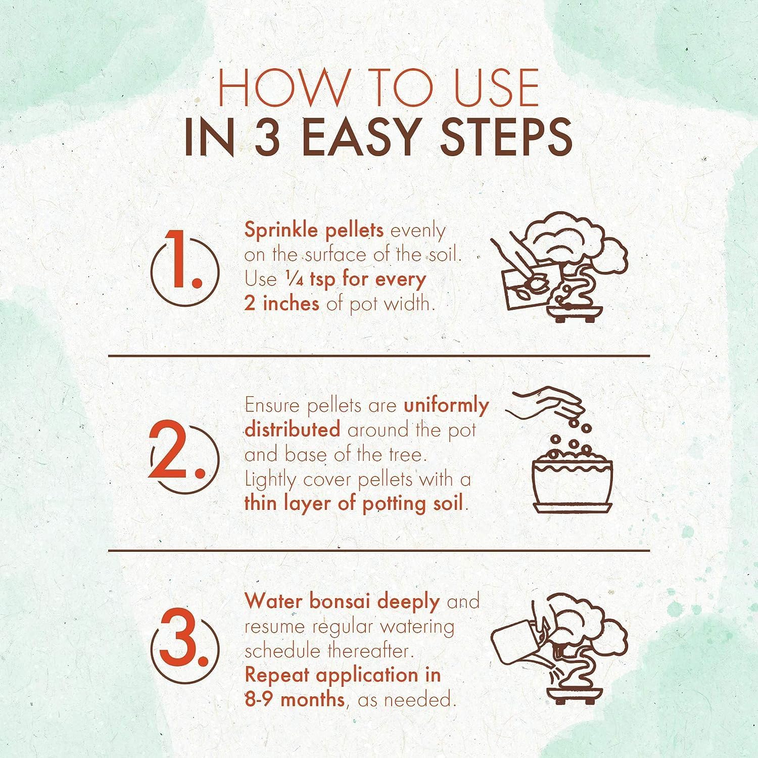 - STRESS FREE - Bonsai care made easy. No need to heavily mix our granular fertilizer into your potting soil. Just carefully place pellets around the base of your tree and watch it thrive with every watering! Great for pots with gravel, moss, pebbles, pumice, lava rocks and other organic soil mixes.