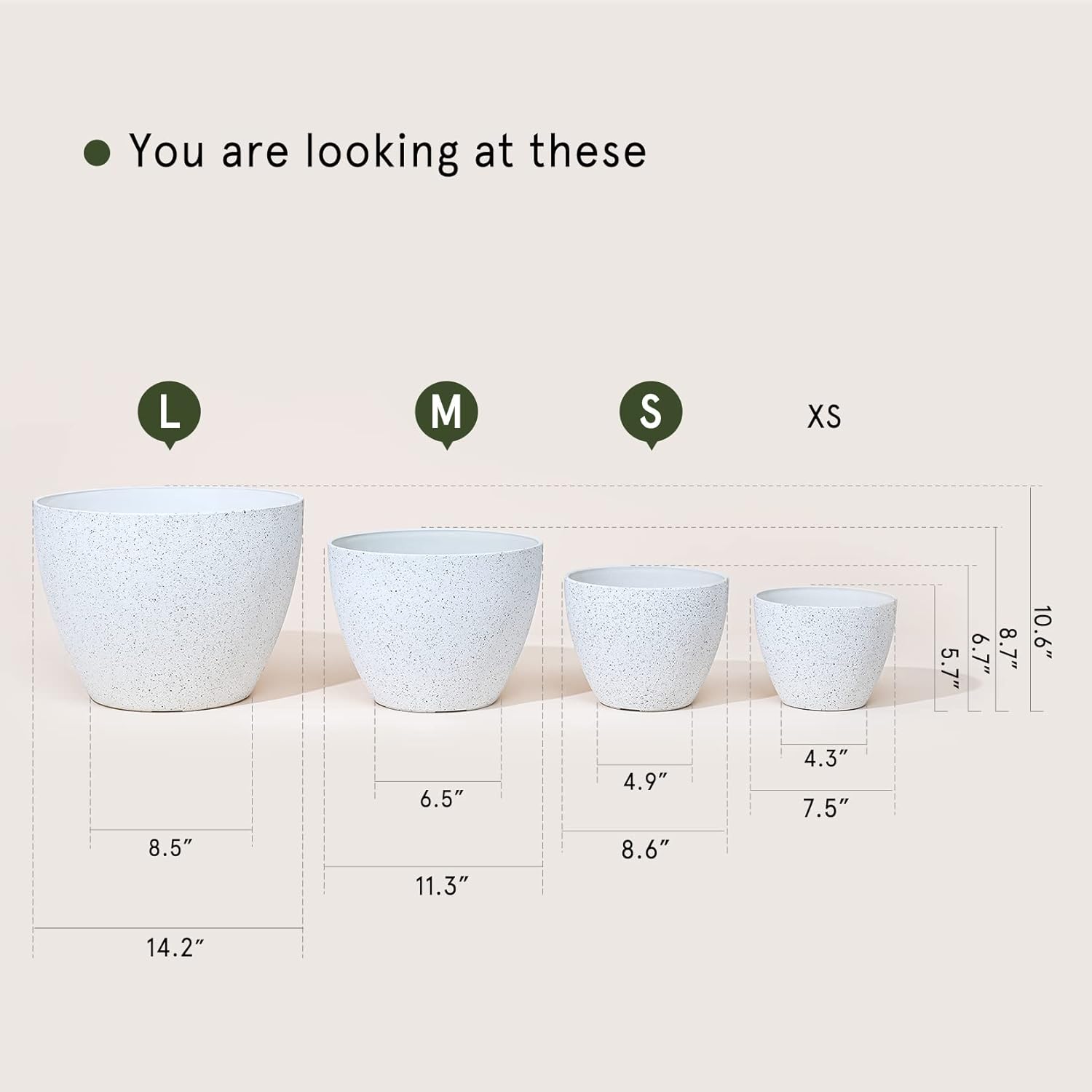 - MODERN GARDEN PLANTER-This set of 3 planters gives you more creative freedom for your different gardening needs.Ferns,pothos,ivy,and spider plants will thrive in this flower pot set,you will love them adorning outdoors,such as patio,yard,orgarden,or enjoy them indoors in the kitchen,livingroom,orbathroom.Size:Large 14.2"Dx10.6"H,Medium-11.4"Dx8.5"H,Small-8.7"Dx6.7"H