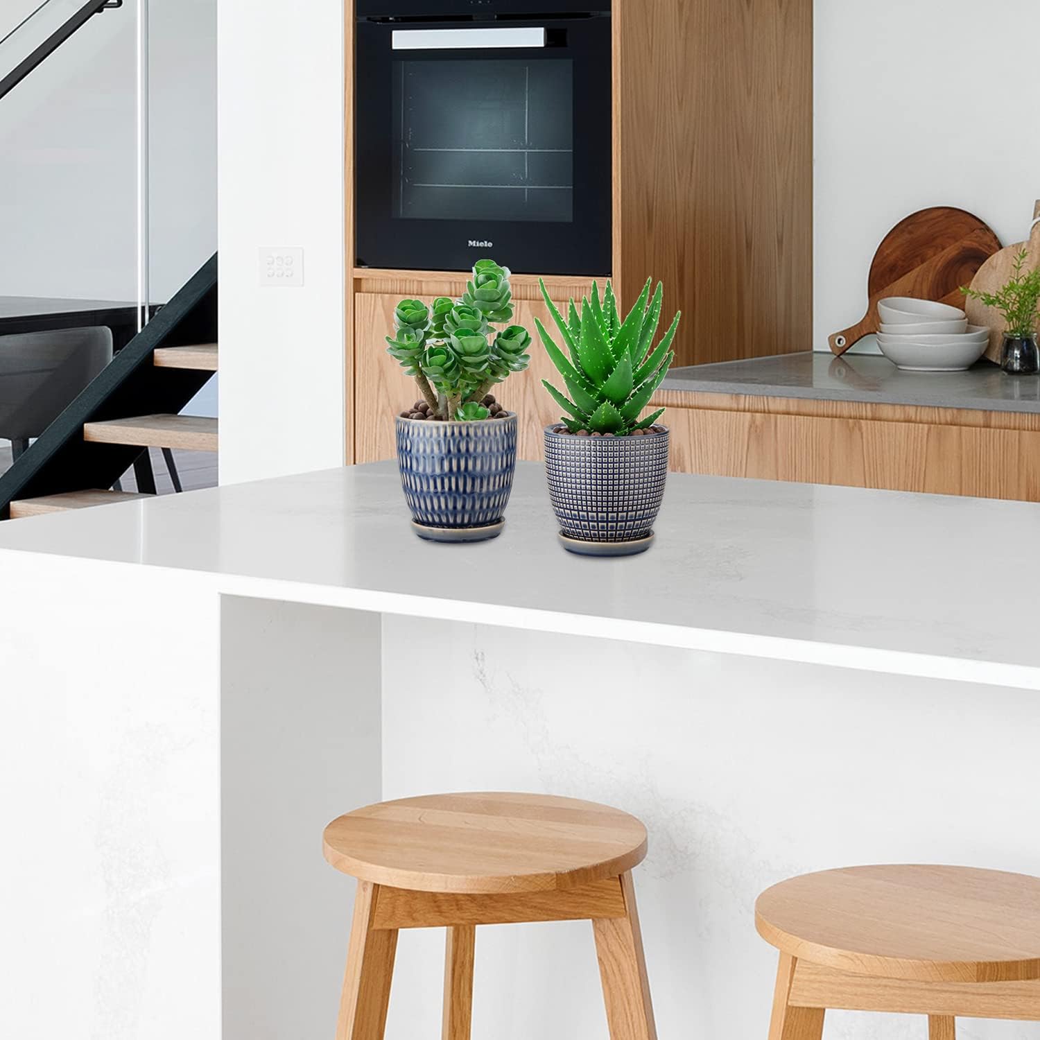 - 【4 inch Pots for Plants】:The shape of the blue ceramic planters for indoor plants adopted a tapered design, carving 3 types different geometric patterns on each surface of the flowerpot, which makes it exquisite and special, it is fits for any home/office decor
