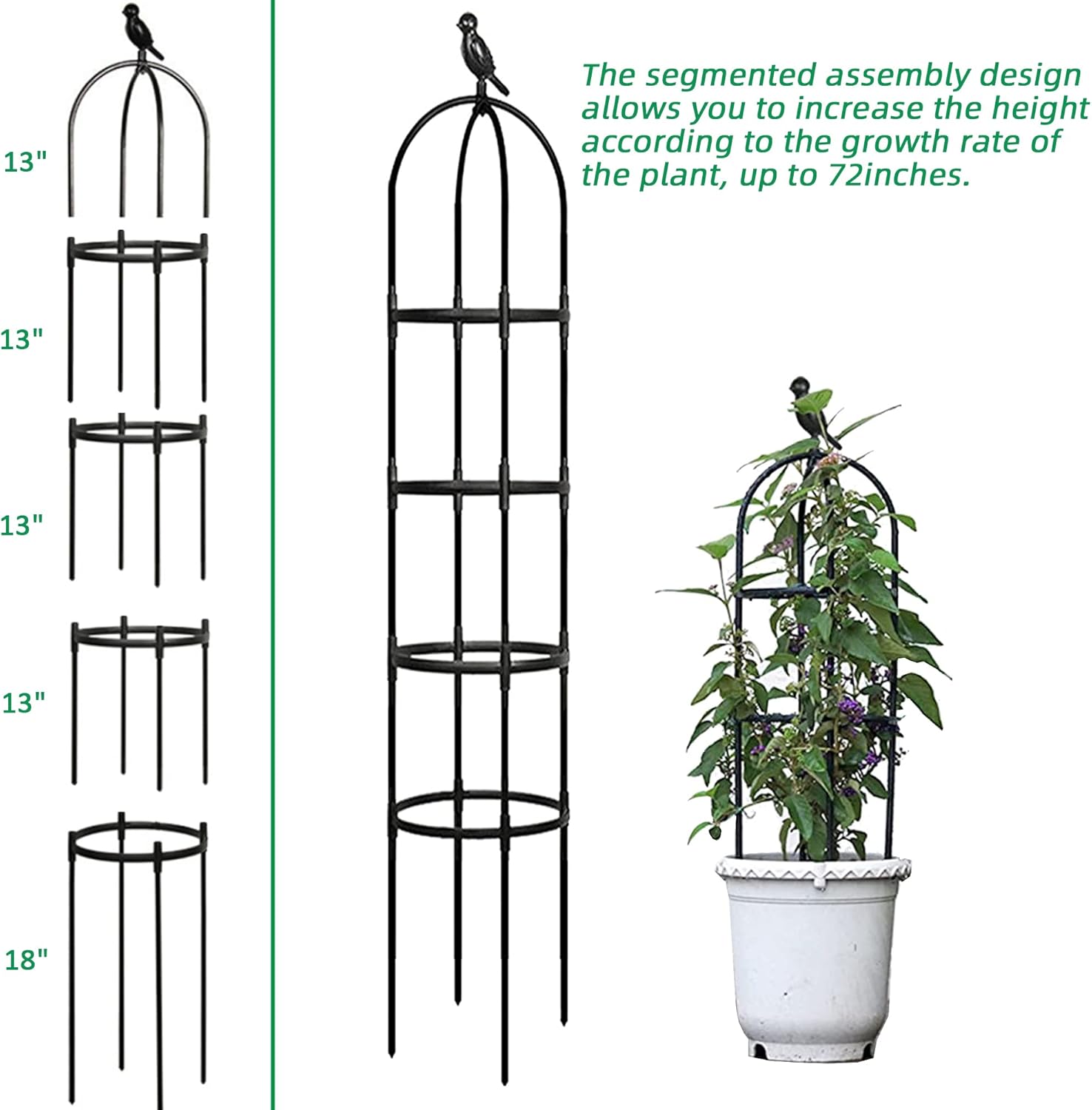 - 【Easy To Install】 - Quick to assemble without tools, the obelisks are also easily disassembled for off-season storage.Note: Please install the longest four plastic pipes to the bottom layer in order to get the largest amount of soil inserted depth