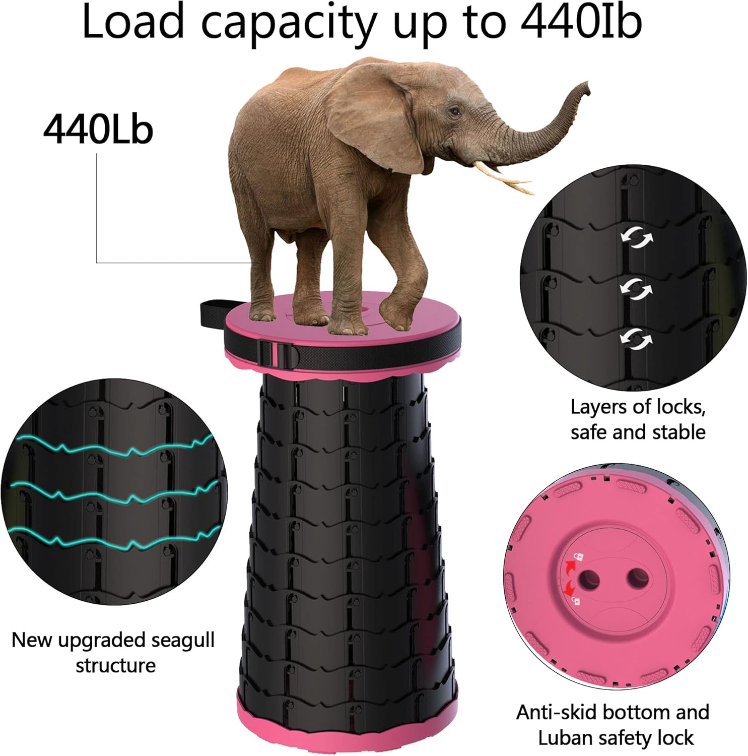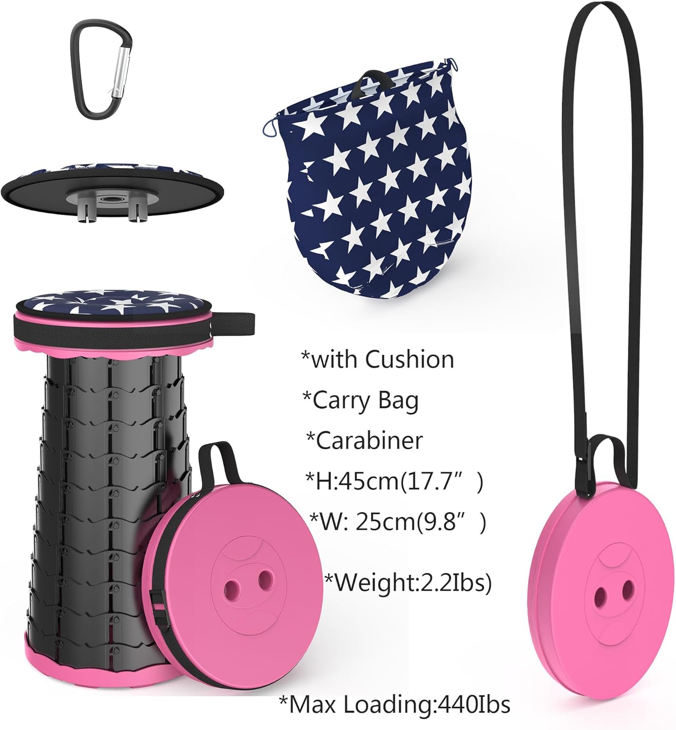 - 【SAFE and STABLE】 Made of environmentally friendly materials, cylindrical structure, tight connection buckles and non-slip base to ensure the stability of the folding stool, providing a safe and comfortable environment for sitting. The maximum load capacity is up to 440 pounds! It's a ideal choice both indoors and outdoors.