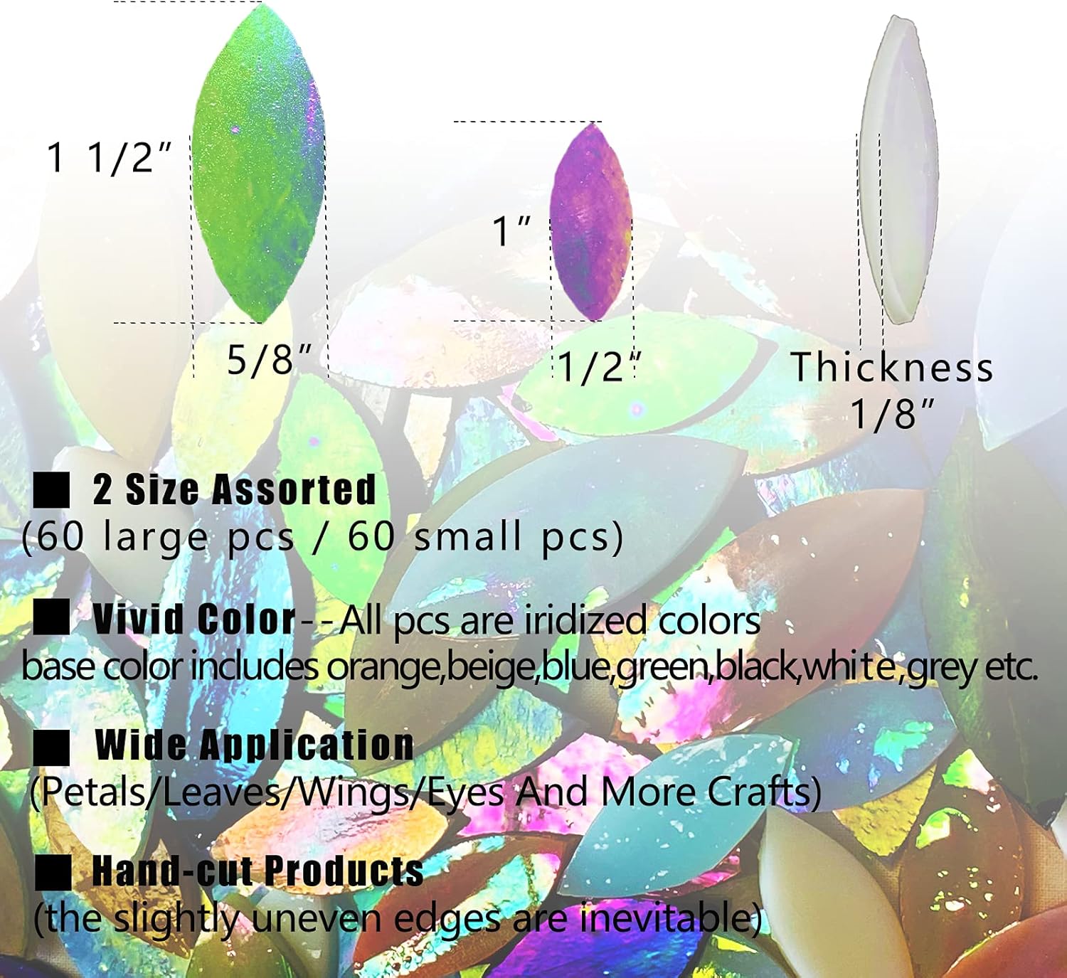 - Iridescent Colors: All pcs are iridized colors, base color includes orange,beige,blue,green,black,white,grey etc.