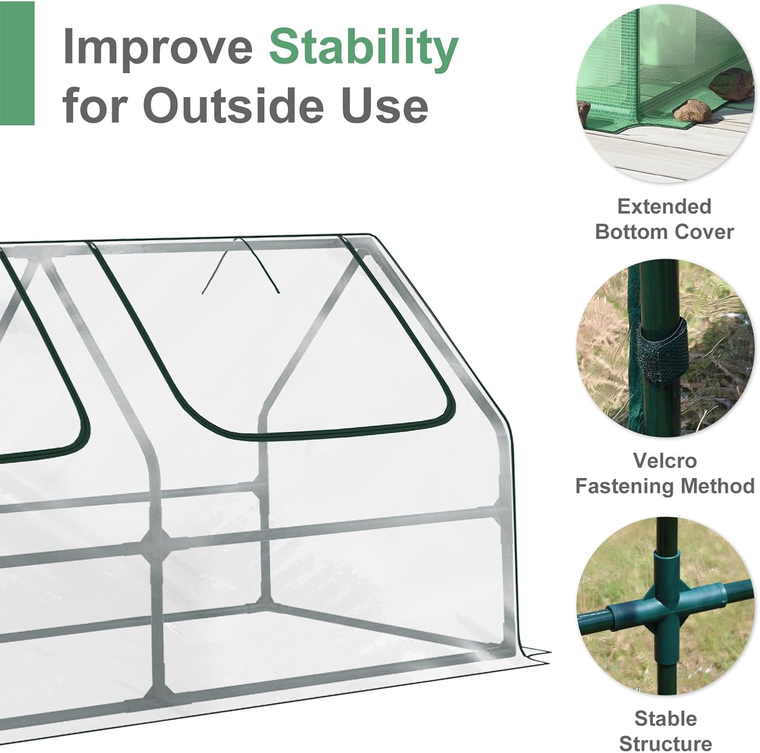 - ROLL-UP DOORS: The dual zipper roll-up doors, secured with tie-down straps, promote airflow and contribute to the greenhouse's visual appeal