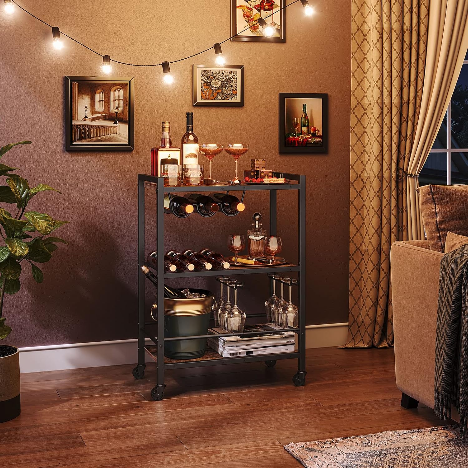 HOOBRO Bar Cart, 3-Tier Coffee Cart with Wheels, Kitchen Cart, Wine Cart with Wine Rack and Glass Holder, Rolling Serving Cart for Home, Living Room, Party, Bar, Rustic Brown and Black BF35TC01G1