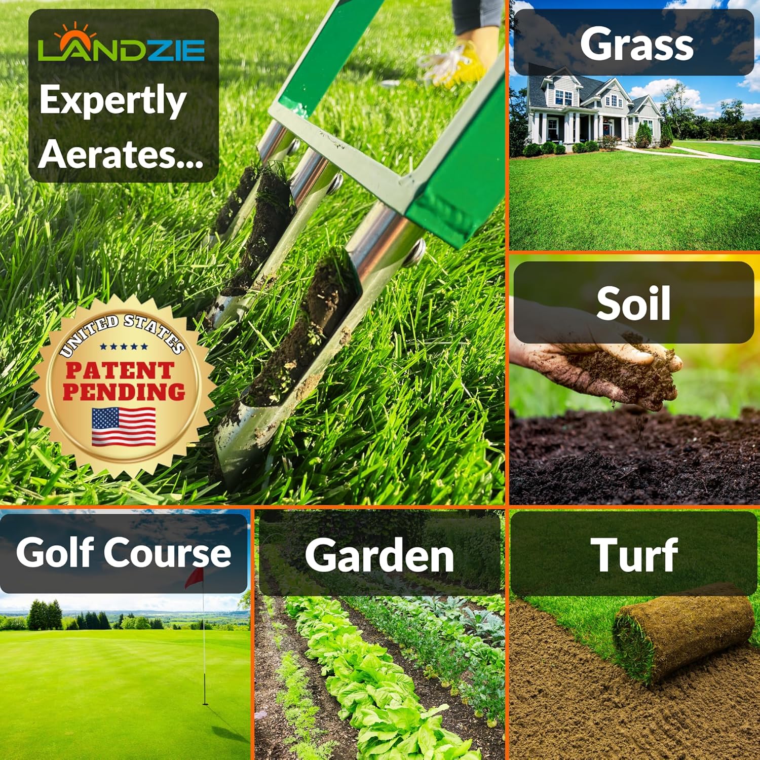 - REVOLUTIONARY CLOG-FREE BEVELED TINES: Landzie has revolutionized the core aerator lawn tool industry by designing a hollow tine lawn aerator tool and lawn core aerator that removes cores of soil. Three solid, stainless steel tines break up soil and allow air, water, and nutrients to penetrate more deeply into the soil, pushing old material up and out of the manual aerator lawn tool each time you press the Landzie Plug Lawn Aerator into the ground. No need to unclog your manual core aerator