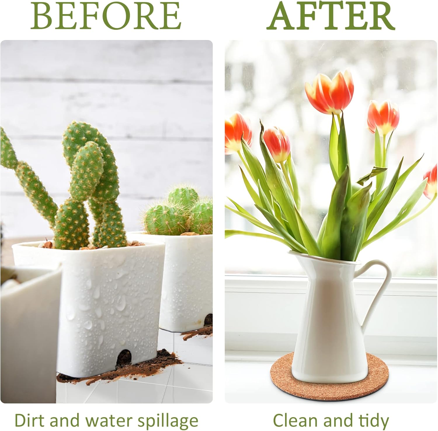 - Protect Flower Pots and Furniture: The main function of these cork plant saucers plant mats is to prevent direct collision and friction between flower pots and furniture and the floor. In addition, it can also effectively prevent water stains in the flowerpot from overflowing, and prevent the floor and furniture from soiling. If cork plant mats are soiled by plants, they can be reused by rinsing them with clean water and drying them