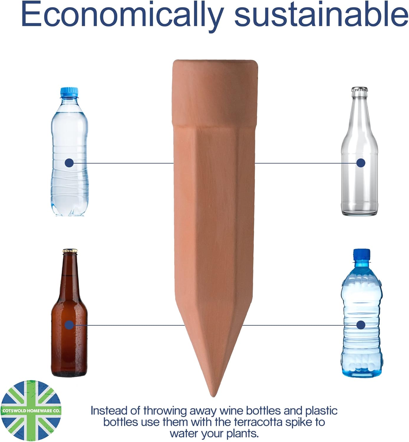 - Designed to use with Recyclable Bottles: Simply dig a hole in the soil. Gently, insert the watering stakes into the soil. Funnel the water through the bottle or wine bottles. Connect the bottle with the terracotta stakes and turn upside down. Insert 7/8 part of the stakes into the planter or soil to ensure slow release garden effect. More terracotta water stakes in the soil, more water is absorbed by the soil.