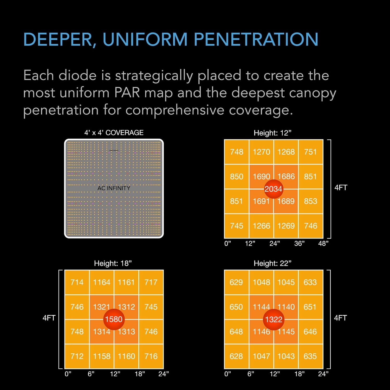 - Algorithmically positioned diodes create the most uniform PAR map and the deepest canopy penetration.