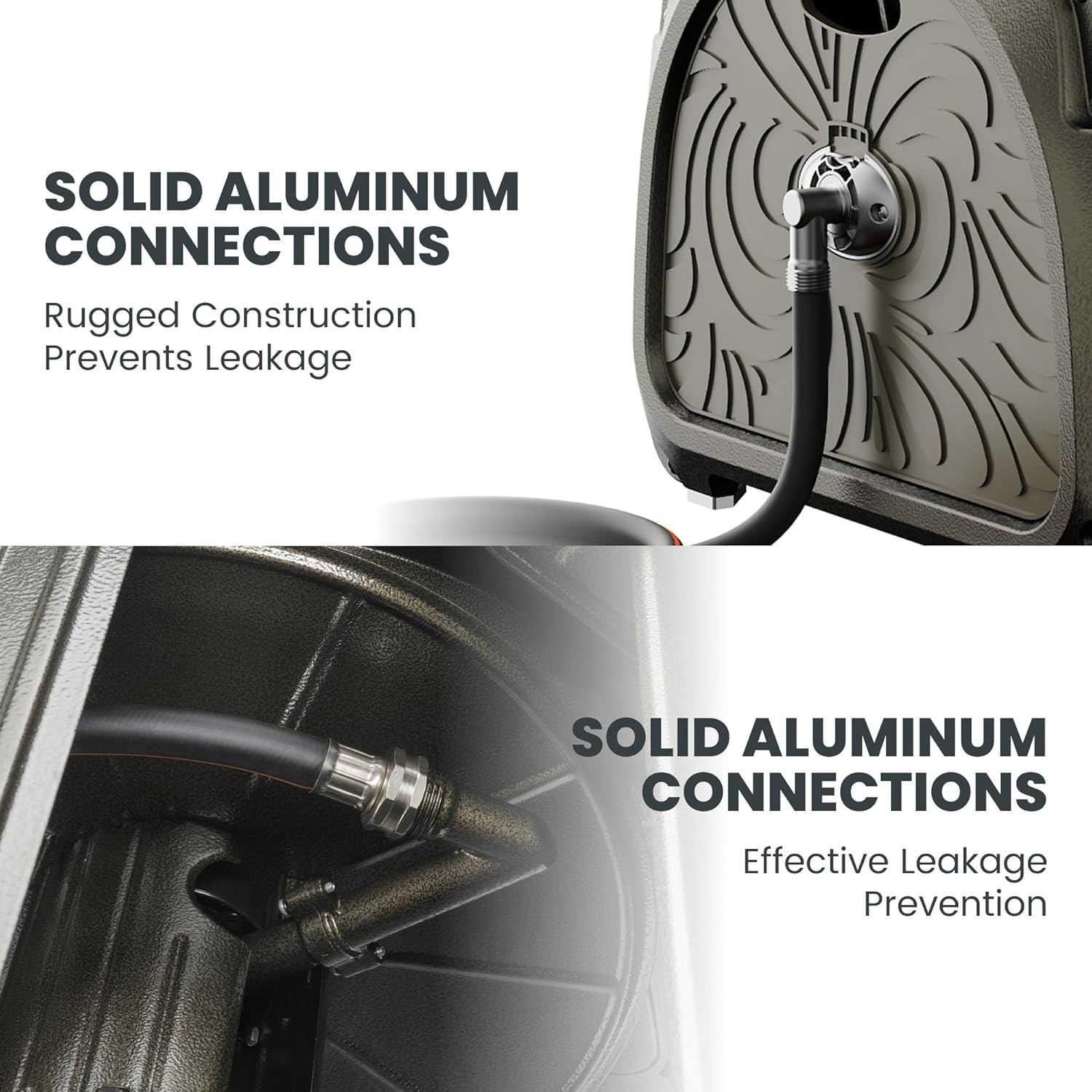- STURDY & DURABLE: The hose reel box is coated with anti-rust material, which can stand firmly under extreme weather. The Aluminum connections guaranteed no leakage, and the heavy metal shell will make it stands firmly when used.