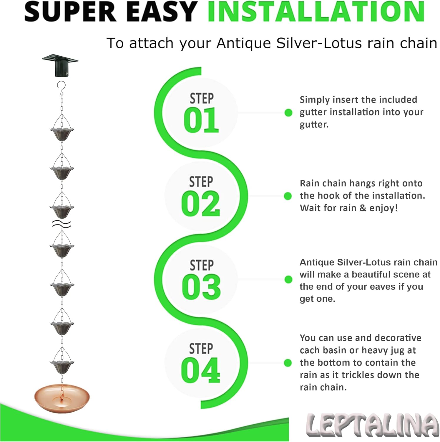 - Featuring 12 beautifully ornate lotus cups, our rain chain adds a chic touch to your roof, awning, or shed. Moreover, the rain chains are painted in an antique silver color, to perfectly complement your roof and garden decor.