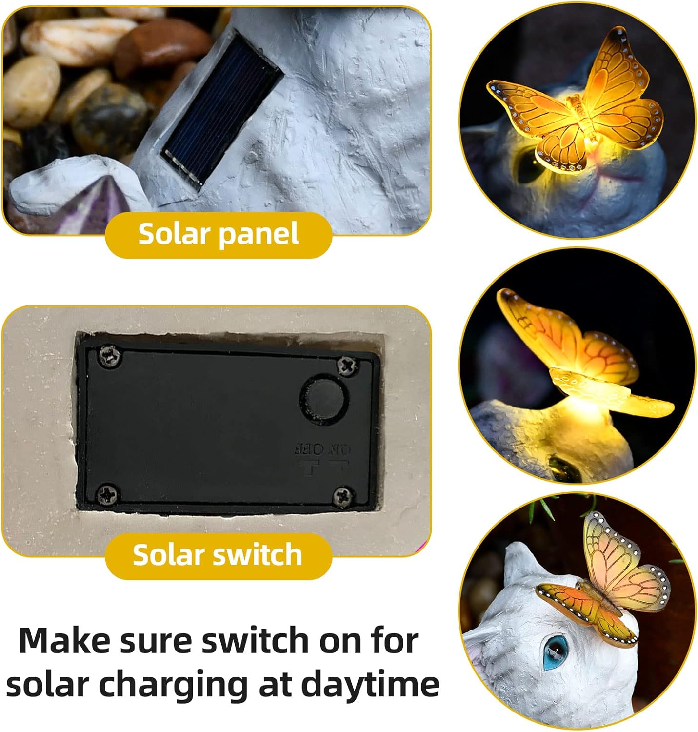 - ▶ Convenience - Cat solar light design will automatically charge and store energy during the daytime, only light up at night or in the dark automatically. You just push the OFF switch to ON for automatic activation at sundown.