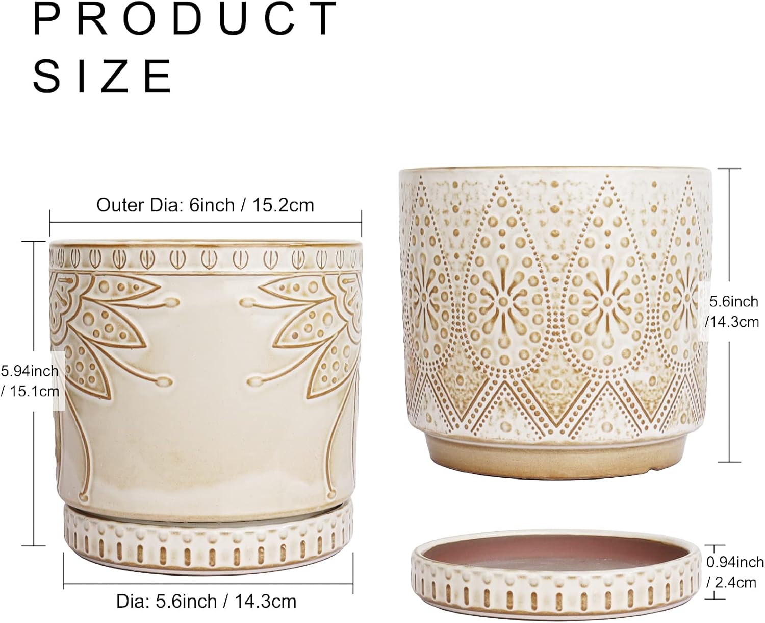 6 Inch Indoor Plant Pots with Drainage Holes and Saucers, Ceramic Planter for Plants, Flower Pot - Set of 2