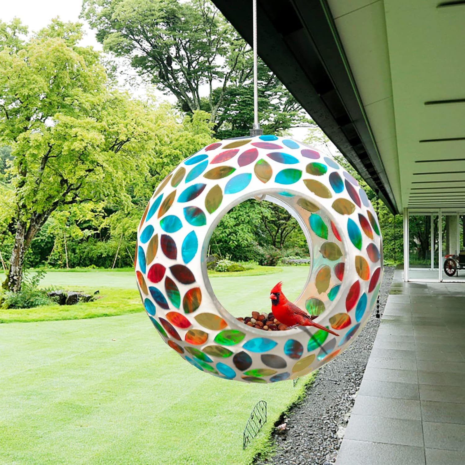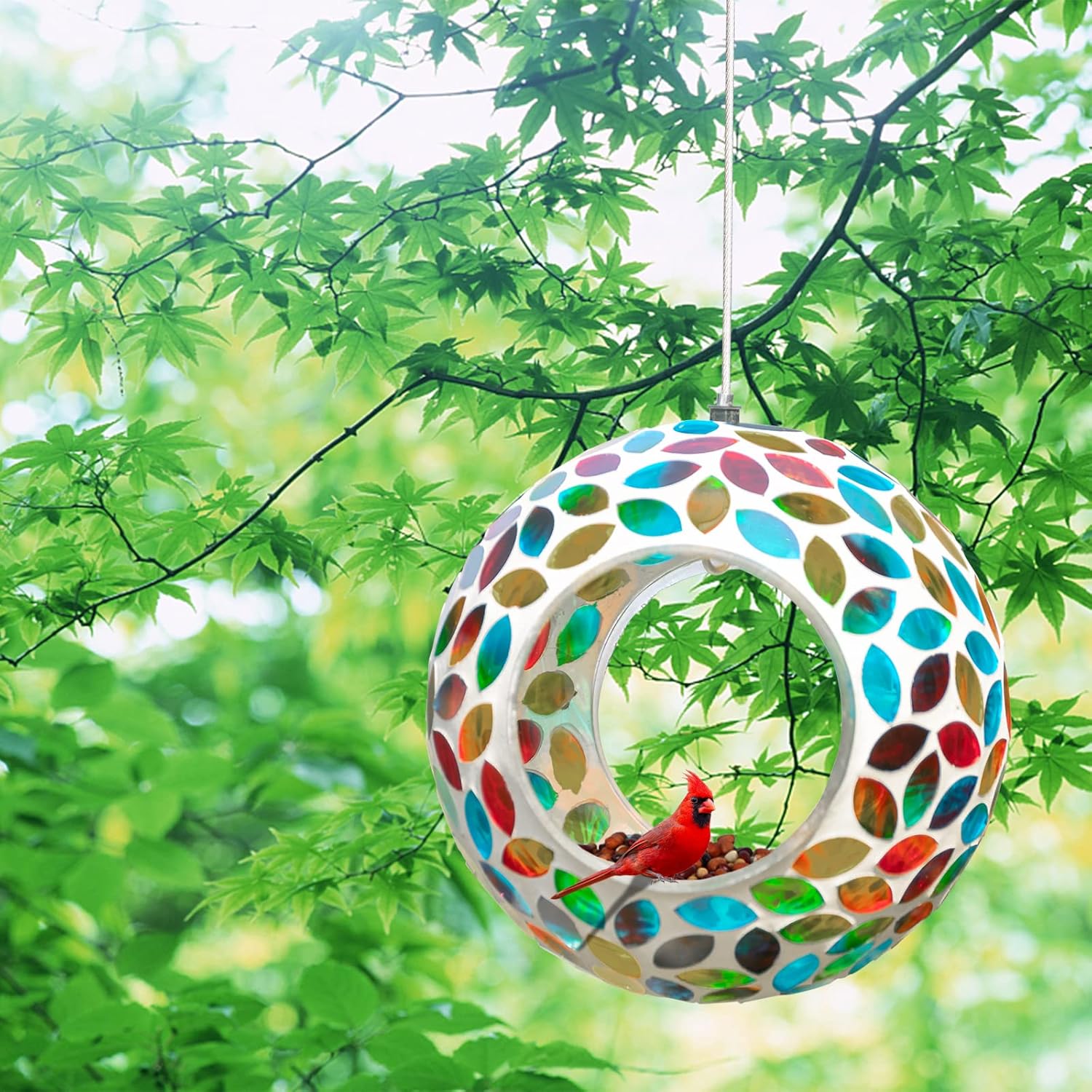 - 【Hanging Bird Feeder】Mosaic hang bird feeders for outdoors is made of strong mortar and glass. Birds can eat from the rim or hop inside during bad weather