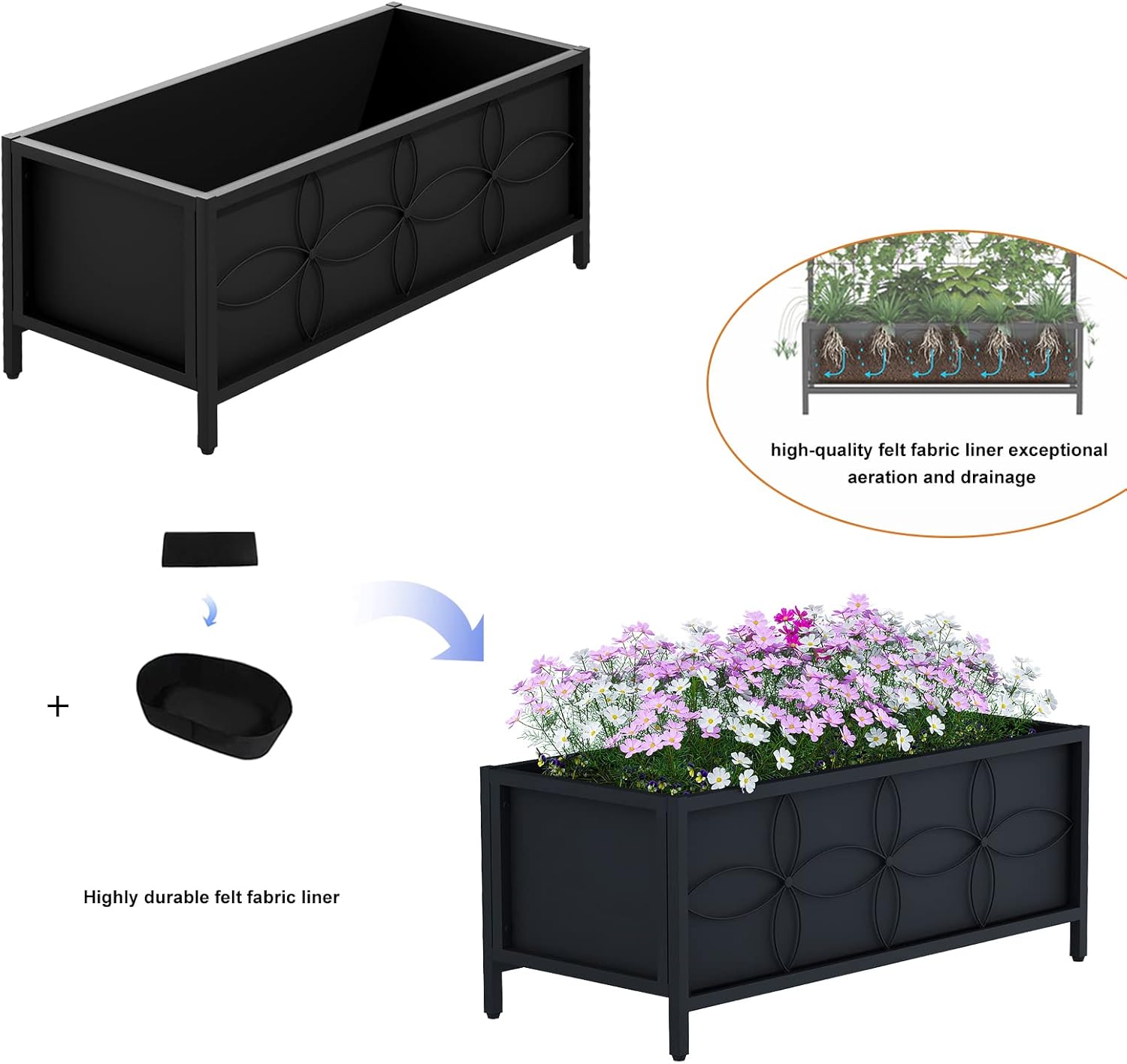 - High-quality felt fabric liner exceptional aeration and drainage. Planter inner Size: 33.85x14.17x11 inch. 11 inch depth is right for most plants. 3 cubic feet, 86 litres soil to fill the planter.