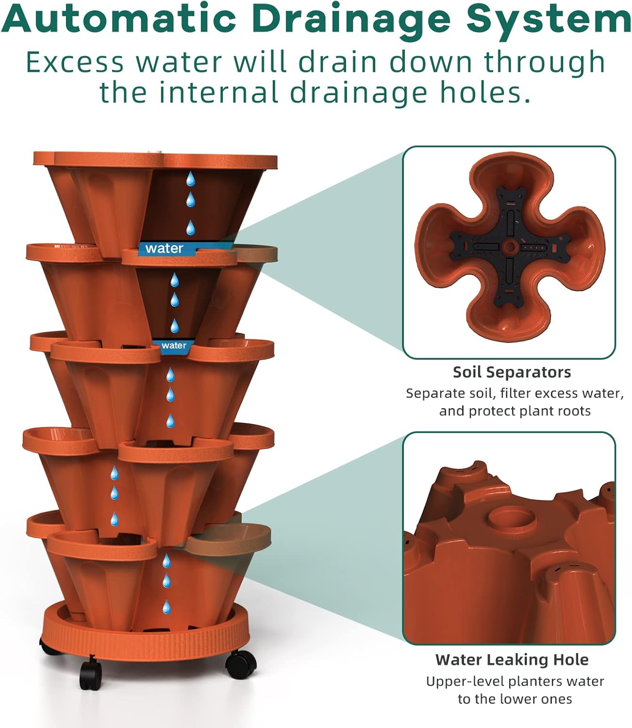 Strawberry Stackable Planter, Vertical Tower Garden, 5 Tiered Stacking Herb Vegetable Planters with Movable Casters and Bottom Saucer Indoor and Outdoor - Terra Cotta