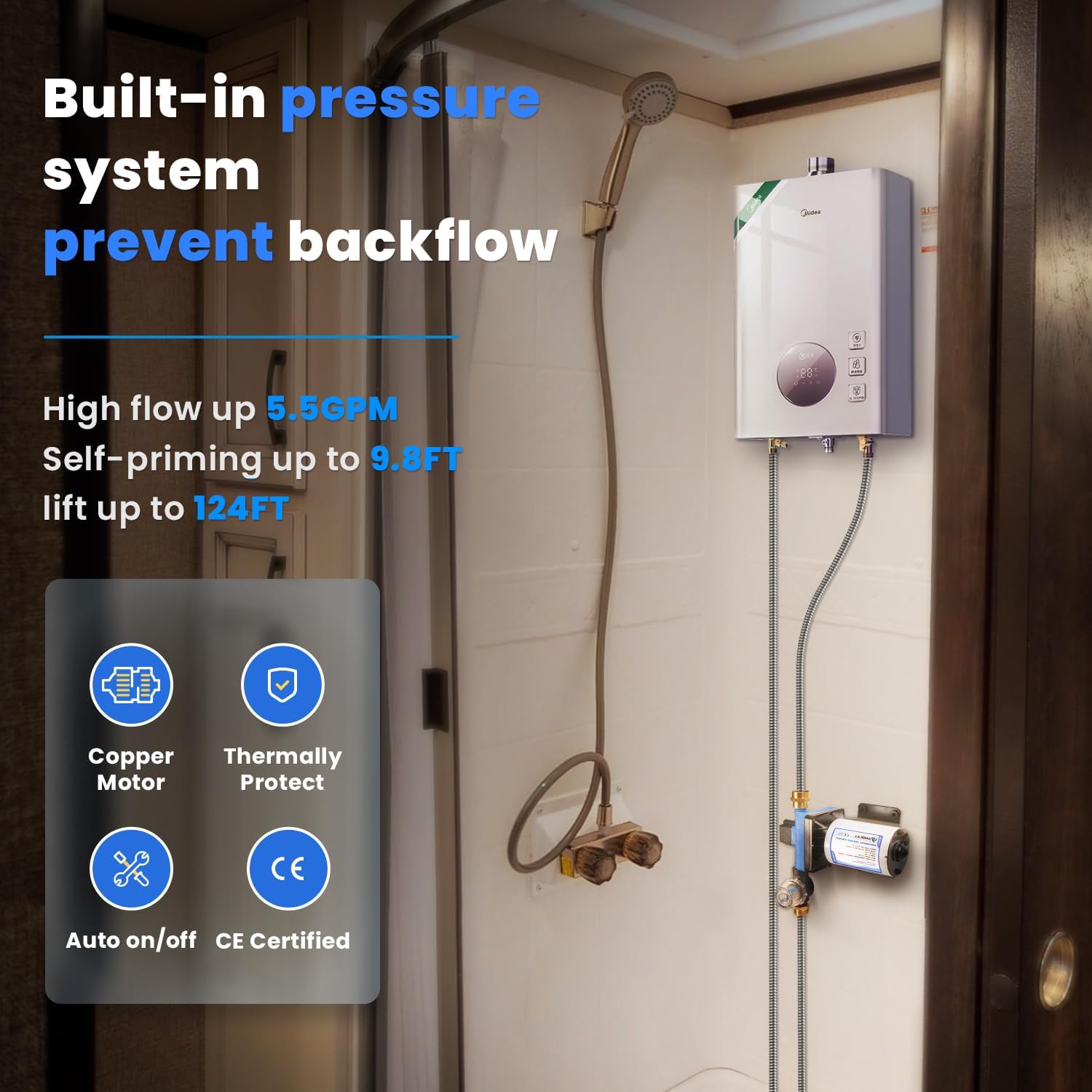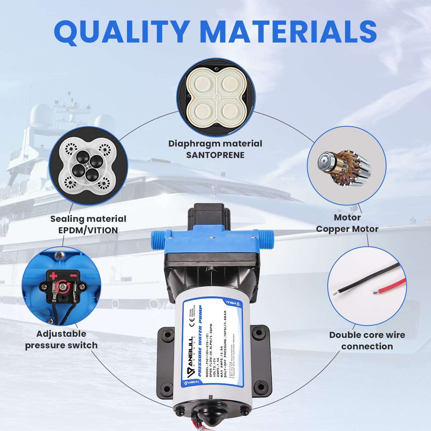 - Professional and Efficient: 1) Strong self-priming ability: The fresh water pump self-priming height up to 9.8 feet, can achieve high flow up to 5.5GPM (20.8LPM).2) Auto close/open: The camper water pump with built-in pressure switch, water supply when the faucet is opened, and power off when the faucet is closed.3) Adjustable pressure switch: Pressure enough to both washing and showering, can adjust according to your needs.