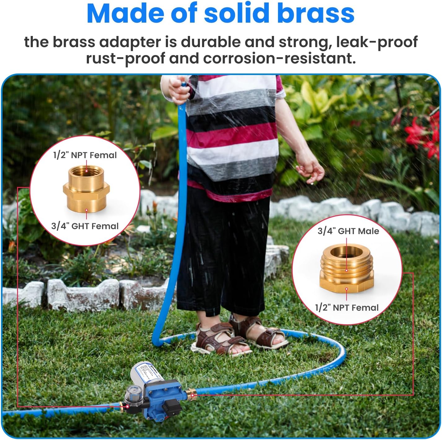 - 12V Water Pump: Voltage:12V; Open Flow:5.5GPM/20.8LPM; Pressure Setting:70PSI/4.8Bar; Outlets:1/2"-14 external thread interface; Brass Adapters:3/4"; AMPS:7.5A (Max 15A); Self-priming Height: 9.8Feet. A really high-quality 12 volt rv pump with low power consumption, high performance and strong suction.