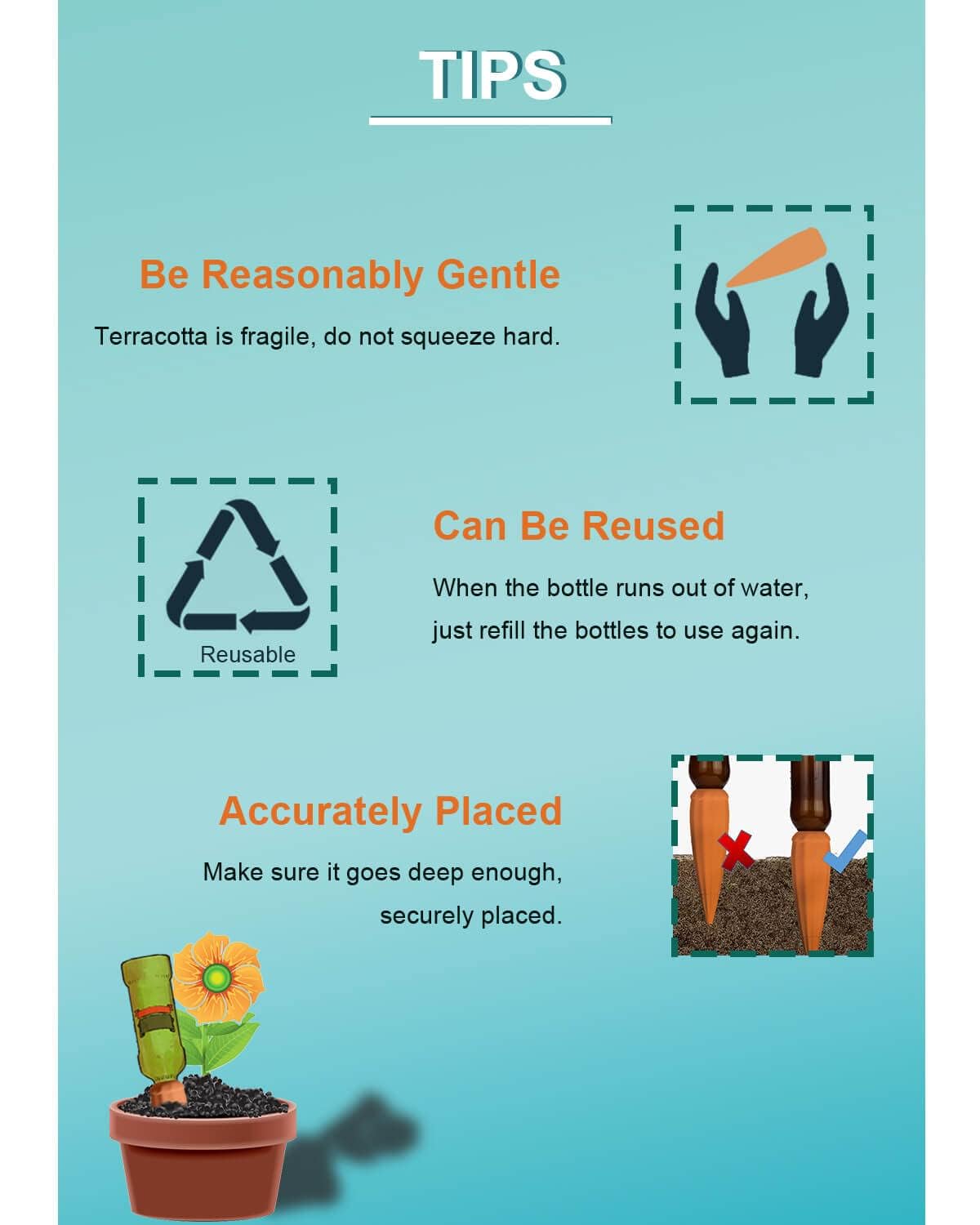 - [ EASY TO USE ]: Just place the water bottle or plastic bottle on top of the self watering spikes, insert it into the soil together, keep it firmly in place, and it will automatically release the water. You can choose how deep you insert it based on your plant's water preferences.