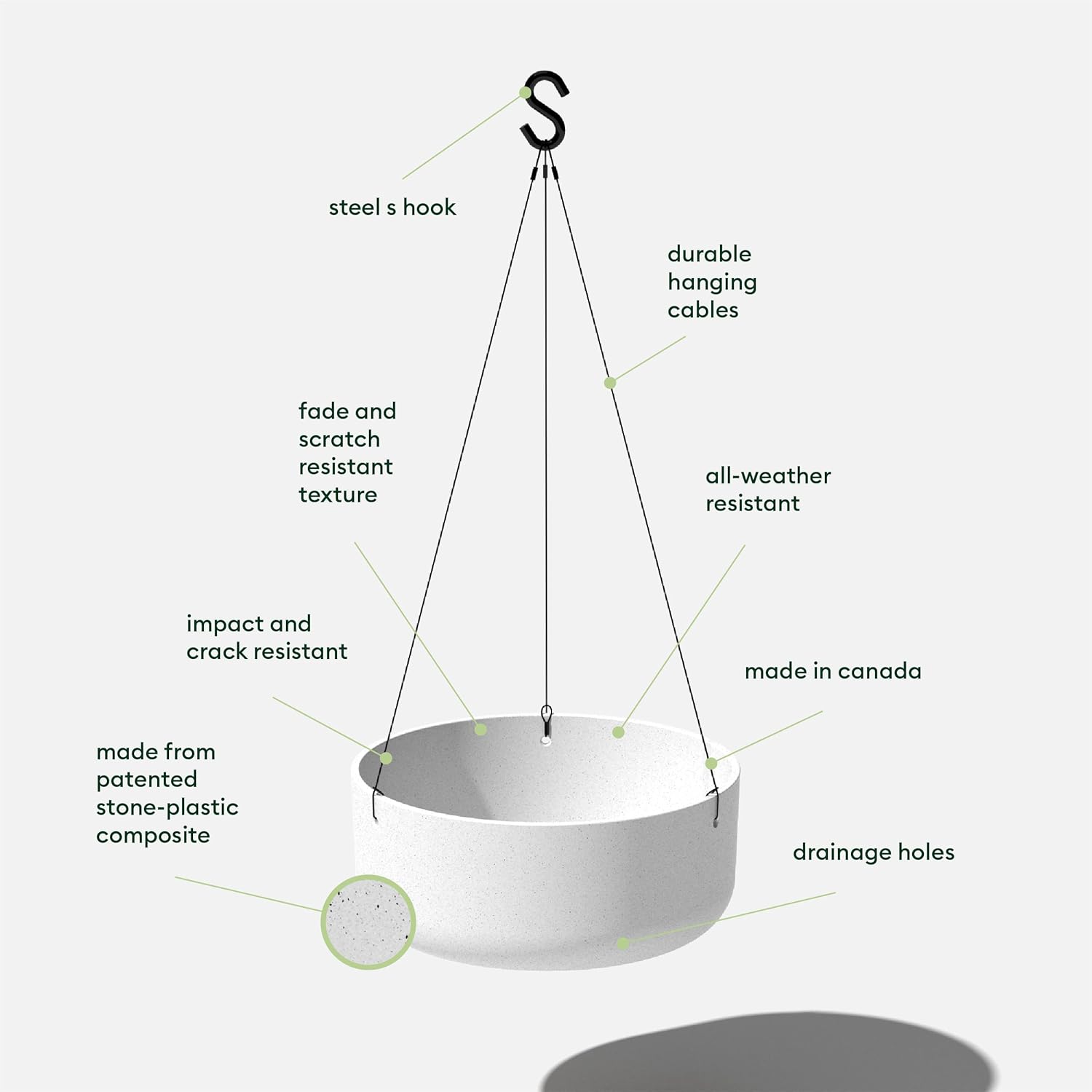 - DURABLE MATERIAL: Made from a plastic-stone composite, the Hanging Kona Bowl planter has a subtle textured finish and is all-weather resistant to cracks, scratches, UV and fading; perfect for hot or cold climates ranging from -20 to +120 degrees