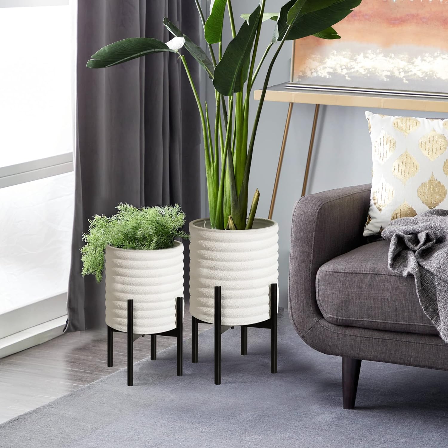 - Mid Century Planter: Black metal stand paired with a classic white planter for mid-century simplicity. A flower pot with a striped design, coated with frosted particles, is simple and atmospheric, never goes out of style. Suitable for a variety of decoration styles.