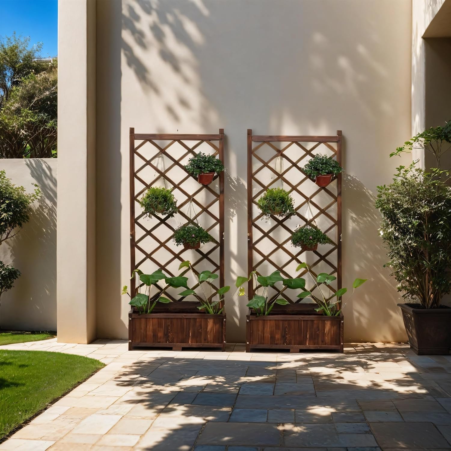 Anraja Raised Garden Bed Planter with Trellis Outdoor Wood Box 67in Set of 2 Flower Standing Planter Box Privacy Lattice Panels with Legs for Patio Porch w/Drainage Holes 29.5" L x 17.0" W x 67.0" H