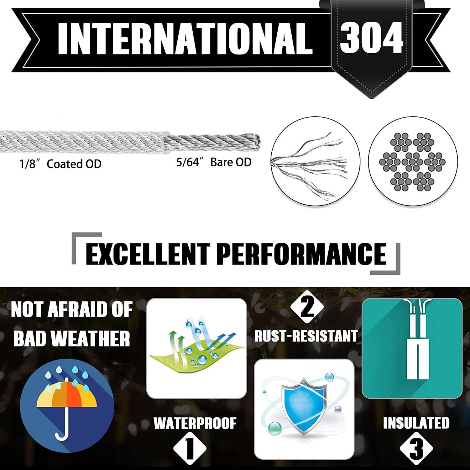 - 3mm Stainless Steel Wire :Made of 304 stainless steel, Wire Rope with 7x7 construction 49 strands of steel wire rope twisted and braided , coated with a layer of PVC to make the surface smoother and free of burrs, and also isolate the steel wire rope from contact with the outside, enhance rust prevention, fine workmanship, strong and durable.